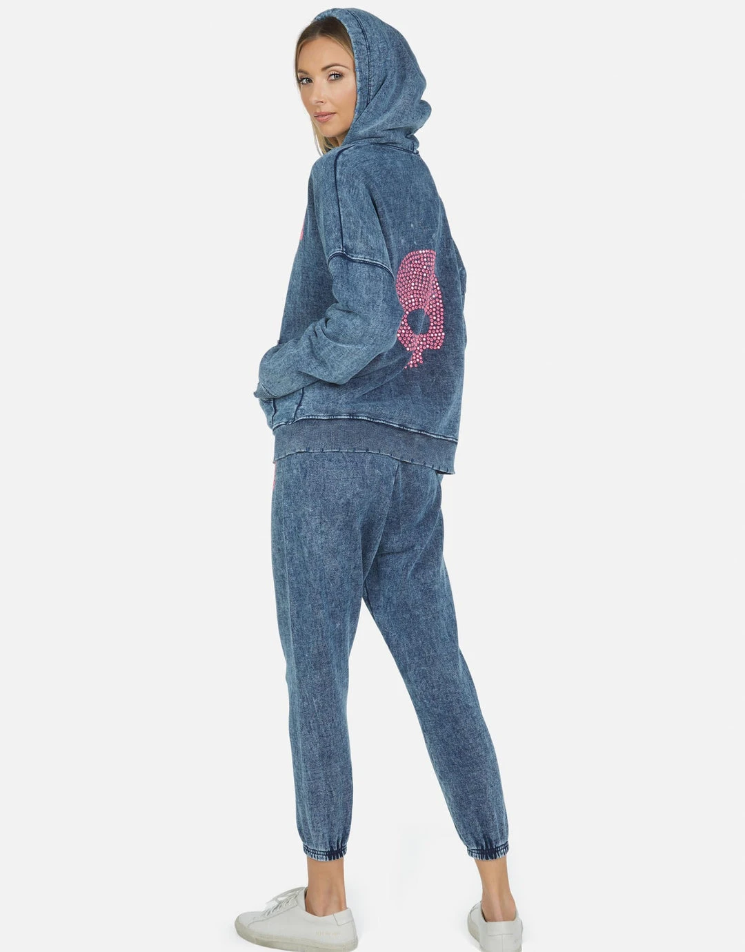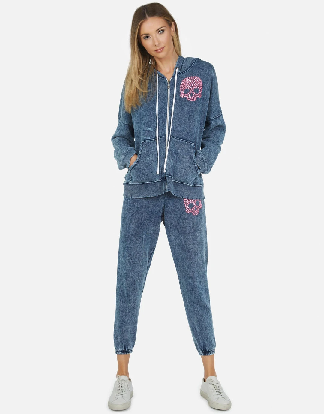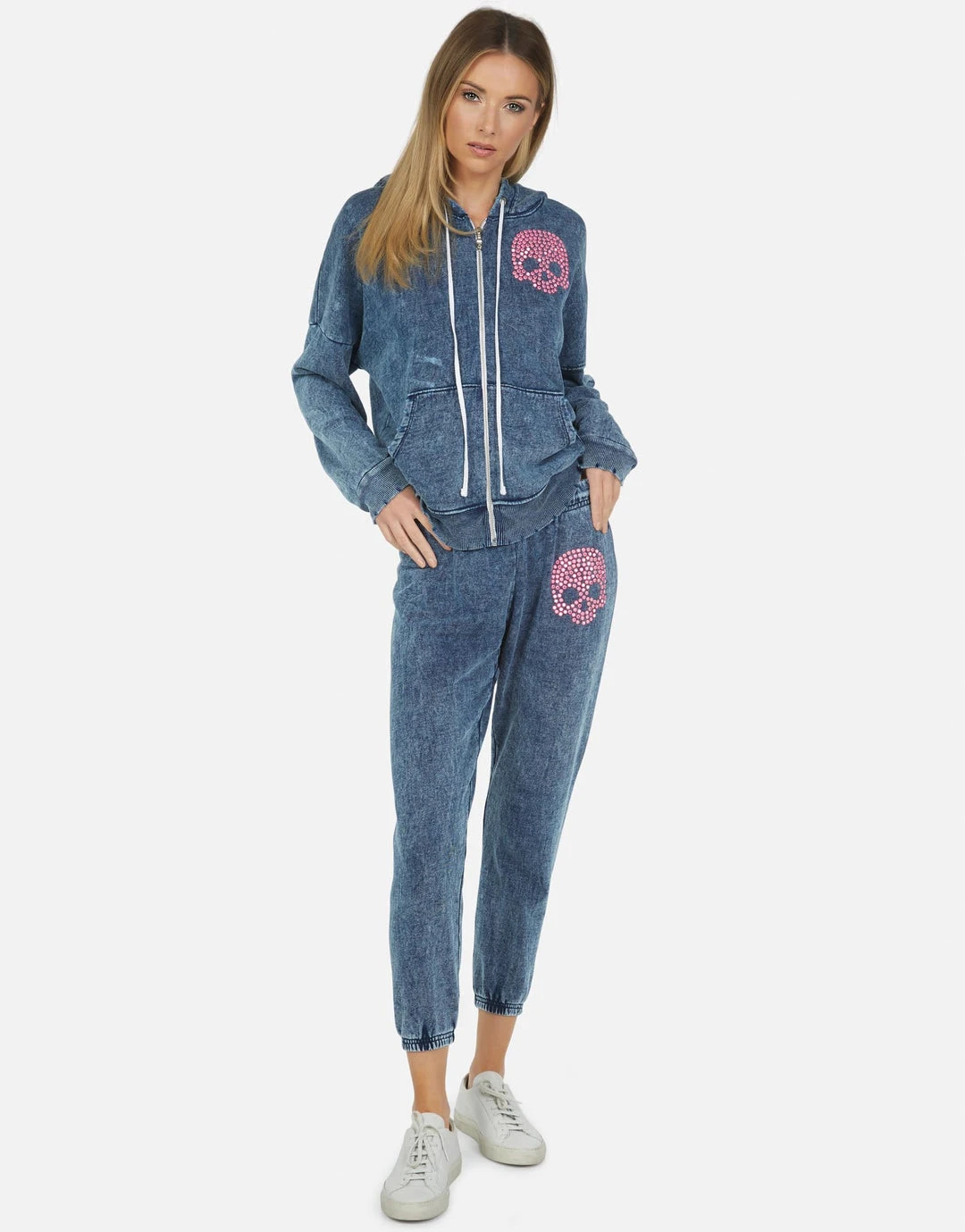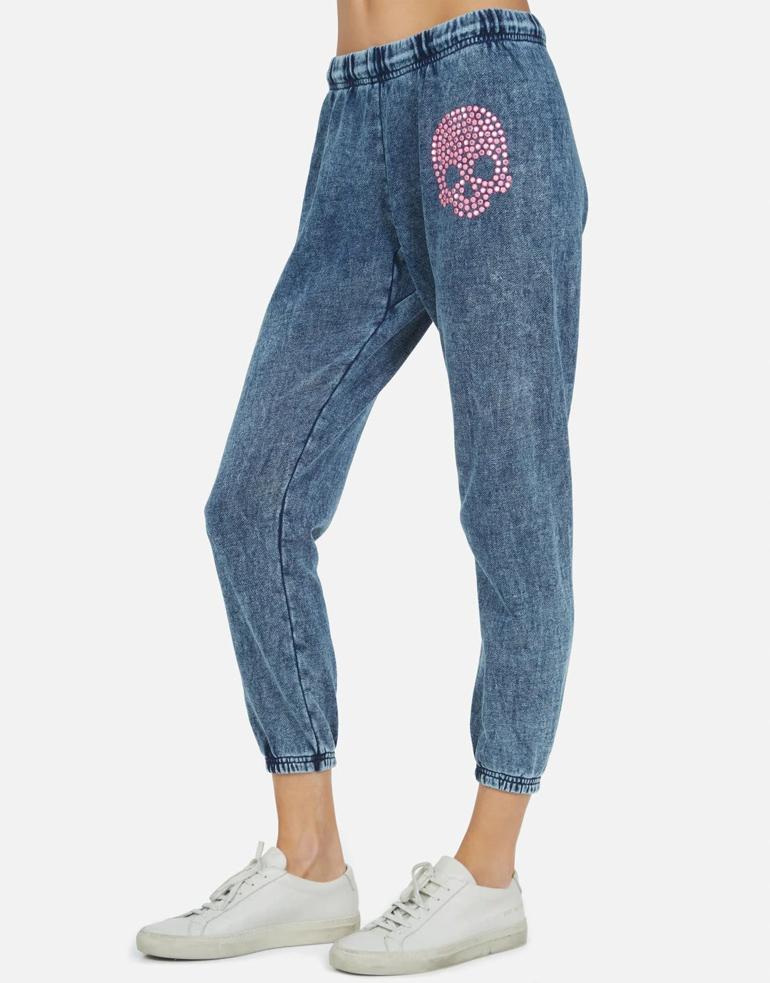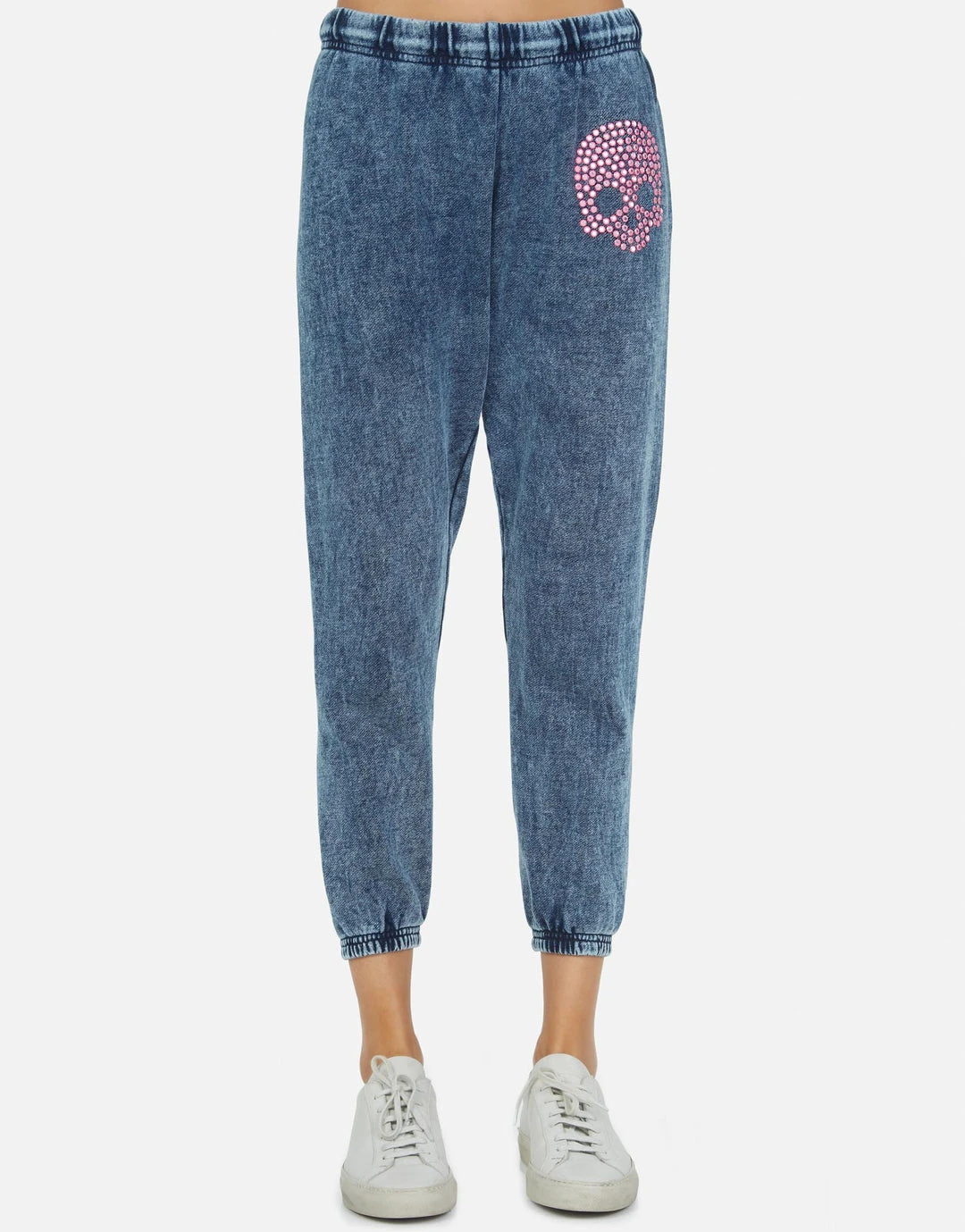 Pink Stud Skull on Ultra Soft Lightweight Sweatpant in Indigo Mineral Wash by Lauren Moshi.