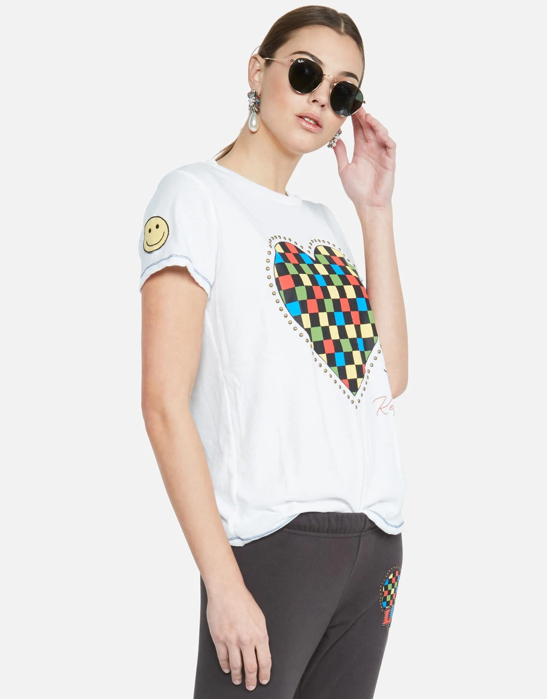 Color Checkered Heart Printed on Ultra Soft Lightweight Tee in White by Lauren Moshi.