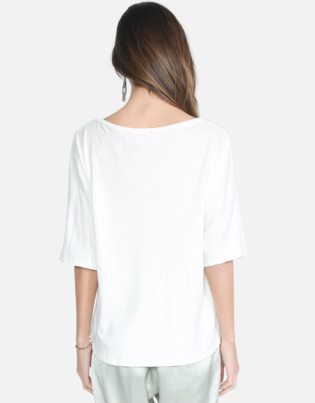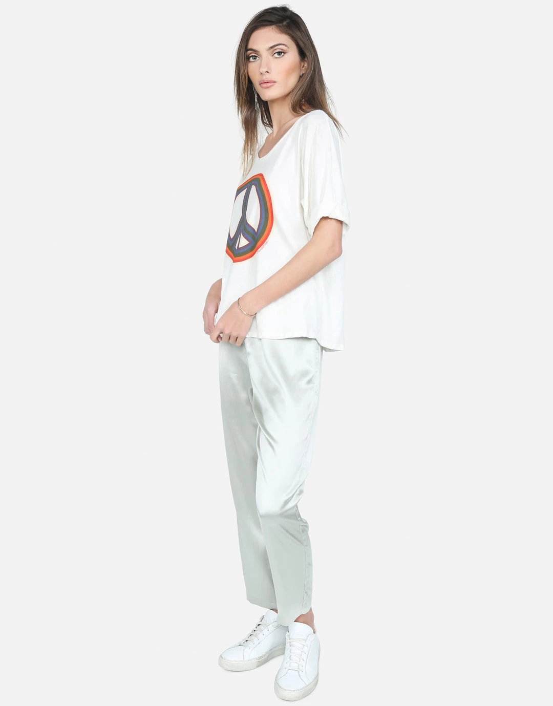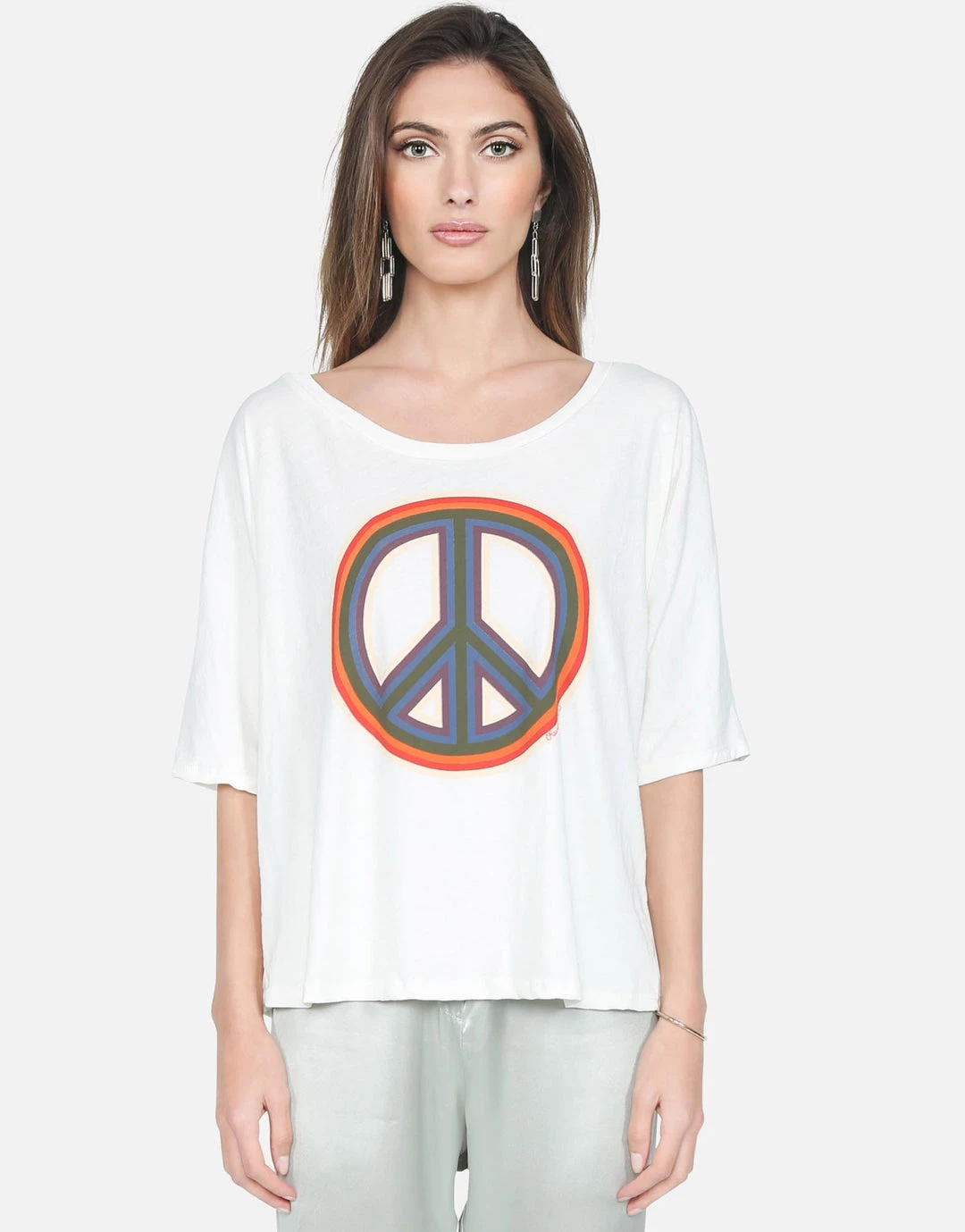 Rainbow Peace Printed on Super Soft Crop Tee in Faded White by Lauren Moshi.