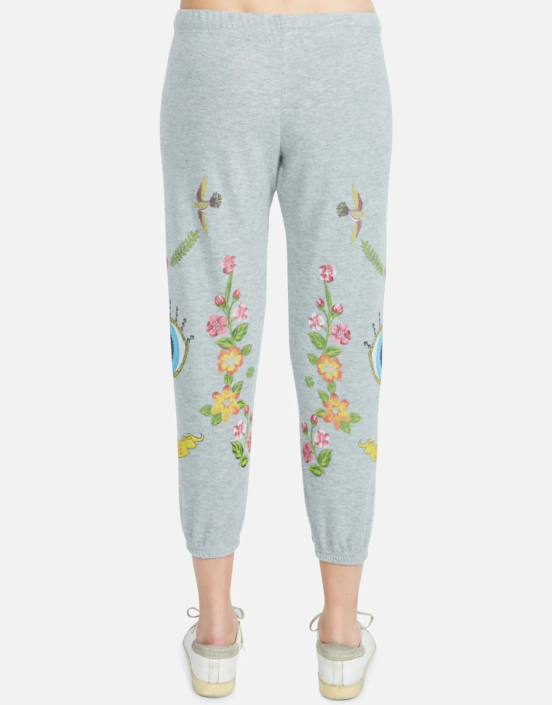 Love Banner Patch w/ Floral Eye Love Printed on Ultra Soft Lightweight Sweatpant in Heather Grey by Lauren Moshi.