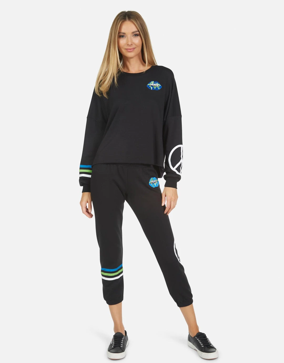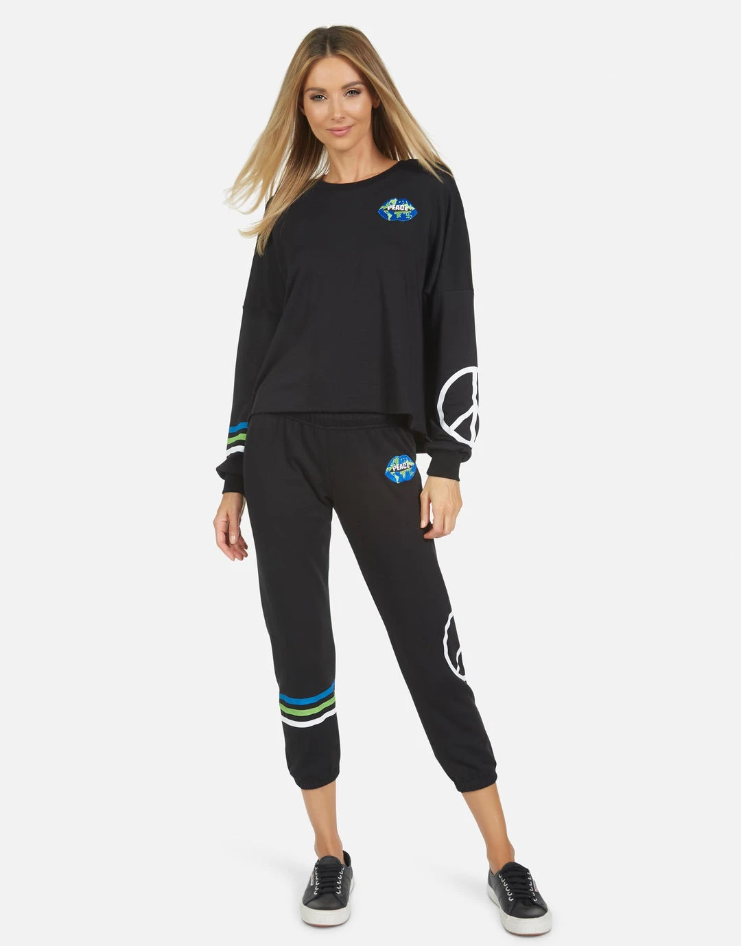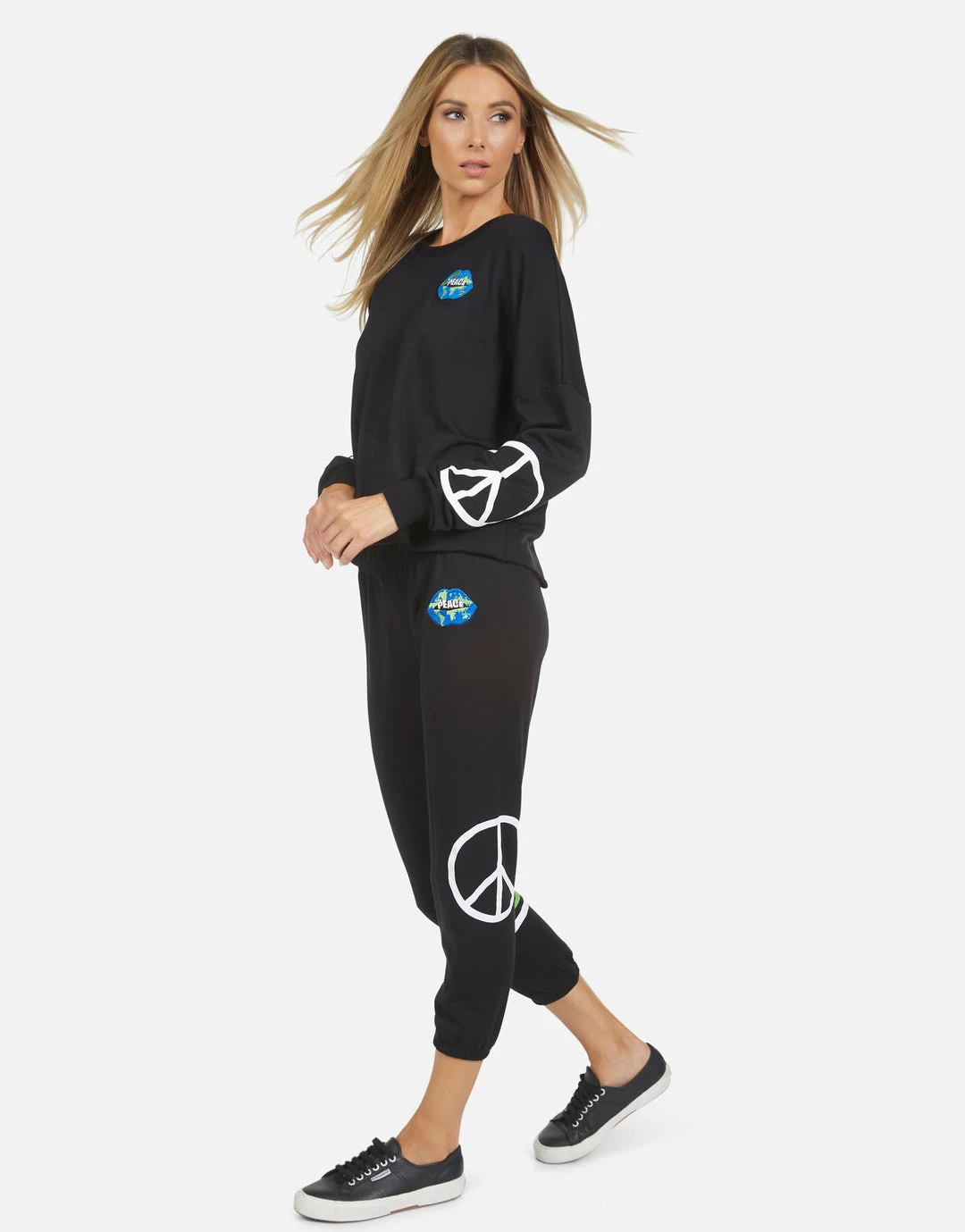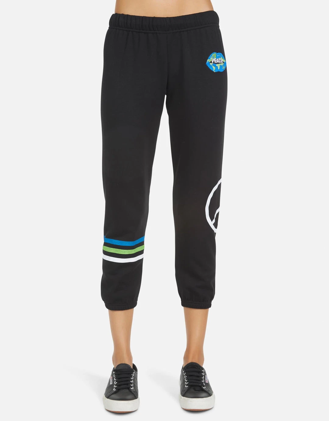 World Peace Lips Printed on Ultra Soft Lightweight Sweatpant in Black by Lauren Moshi.