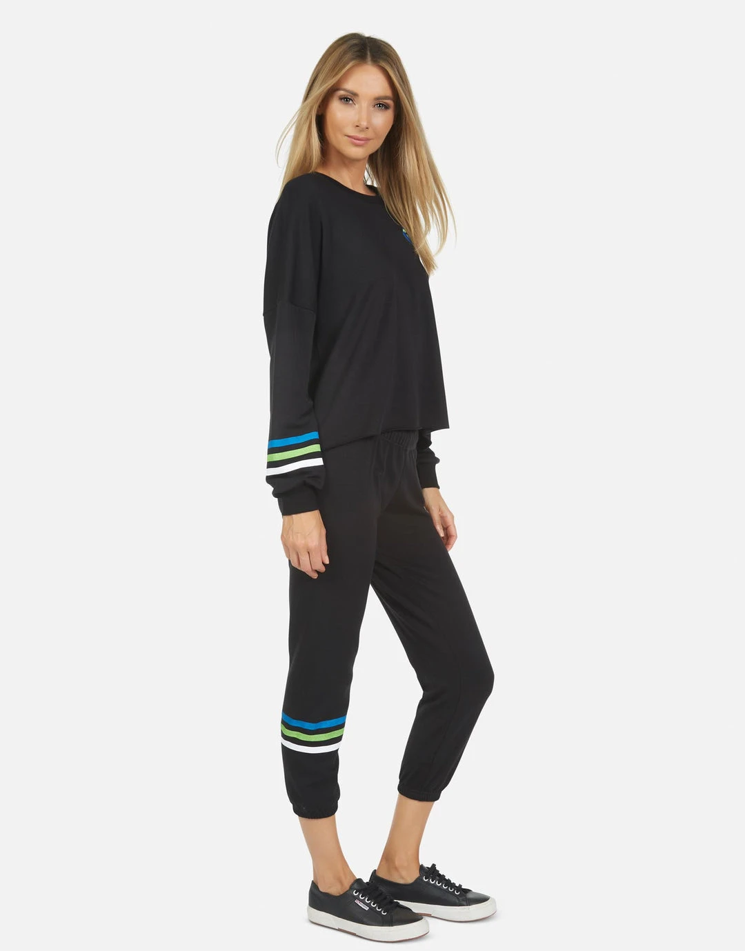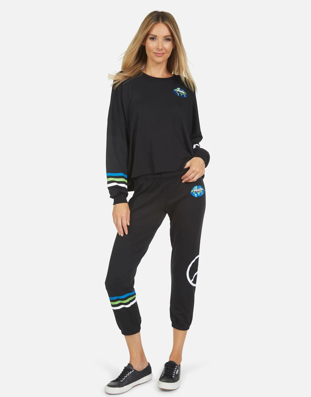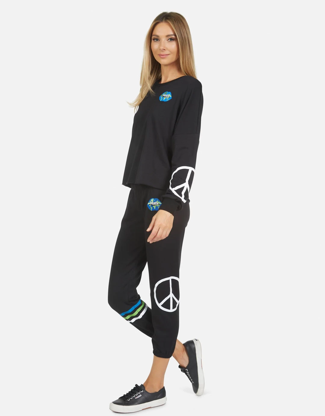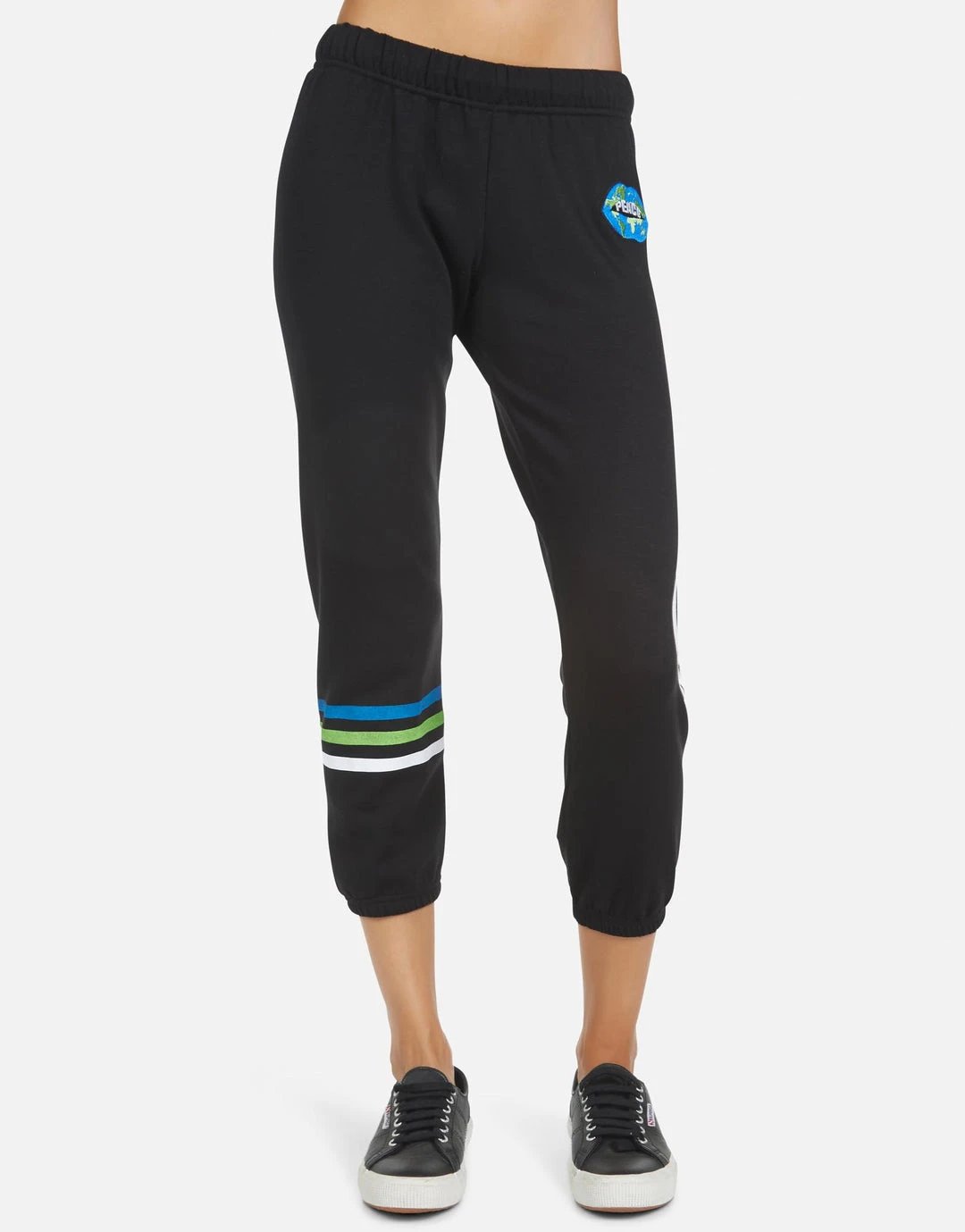 World Peace Lips Printed on Ultra Soft Lightweight Sweatpant in Black by Lauren Moshi.