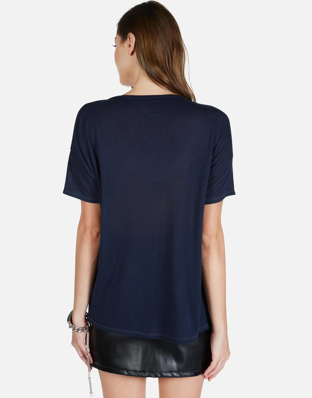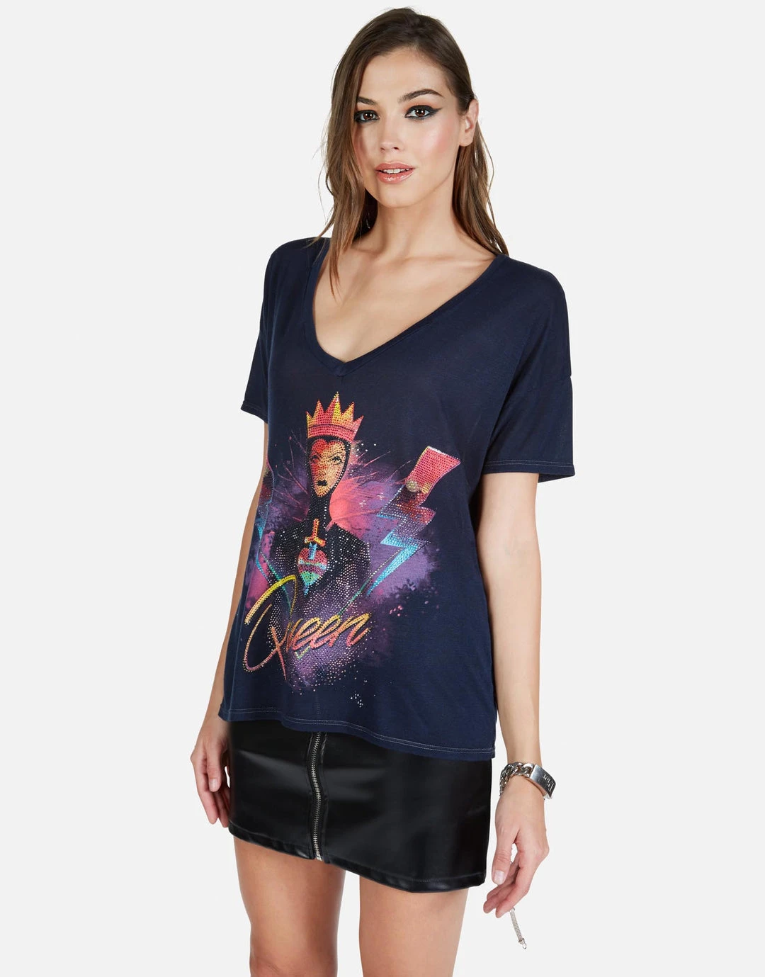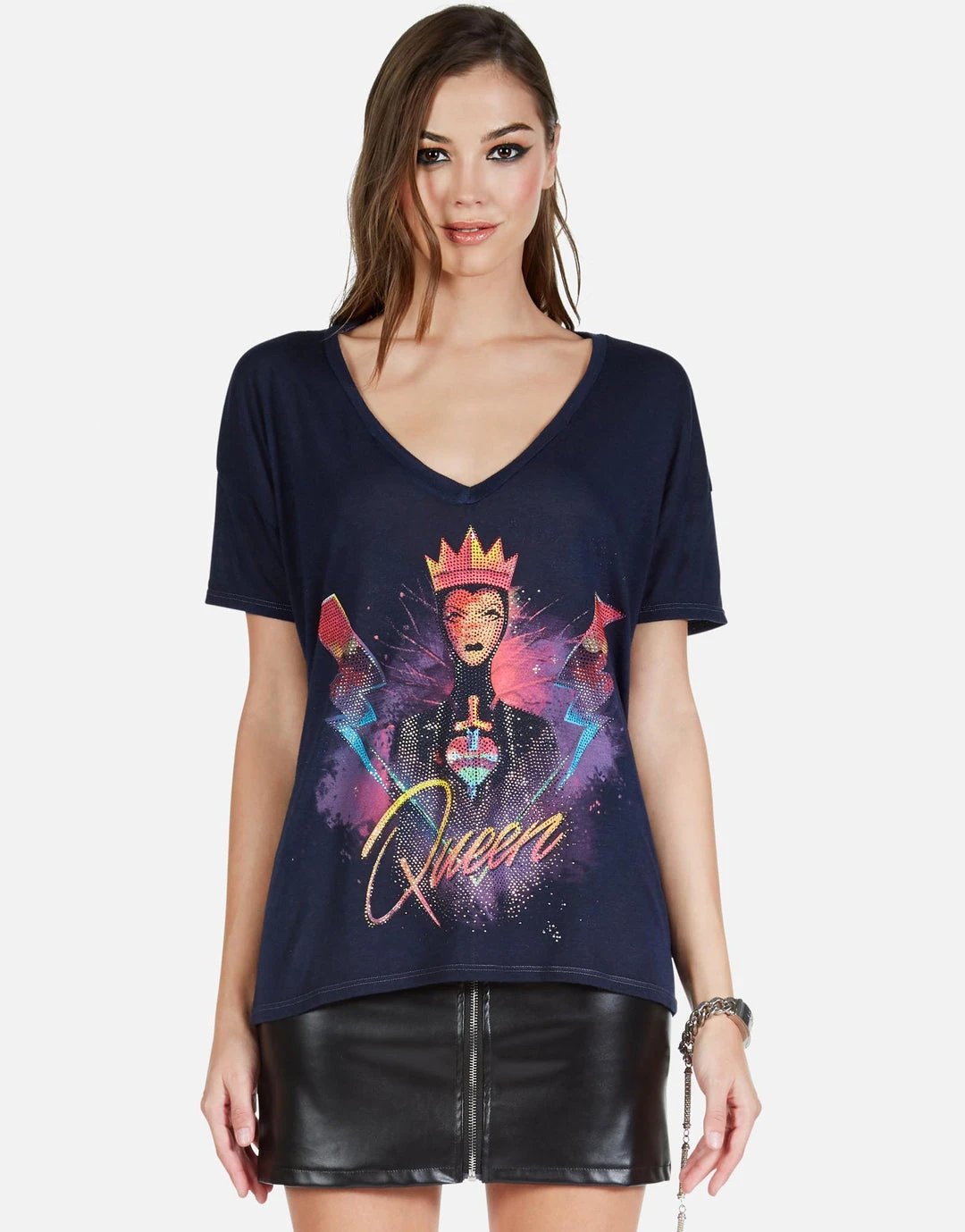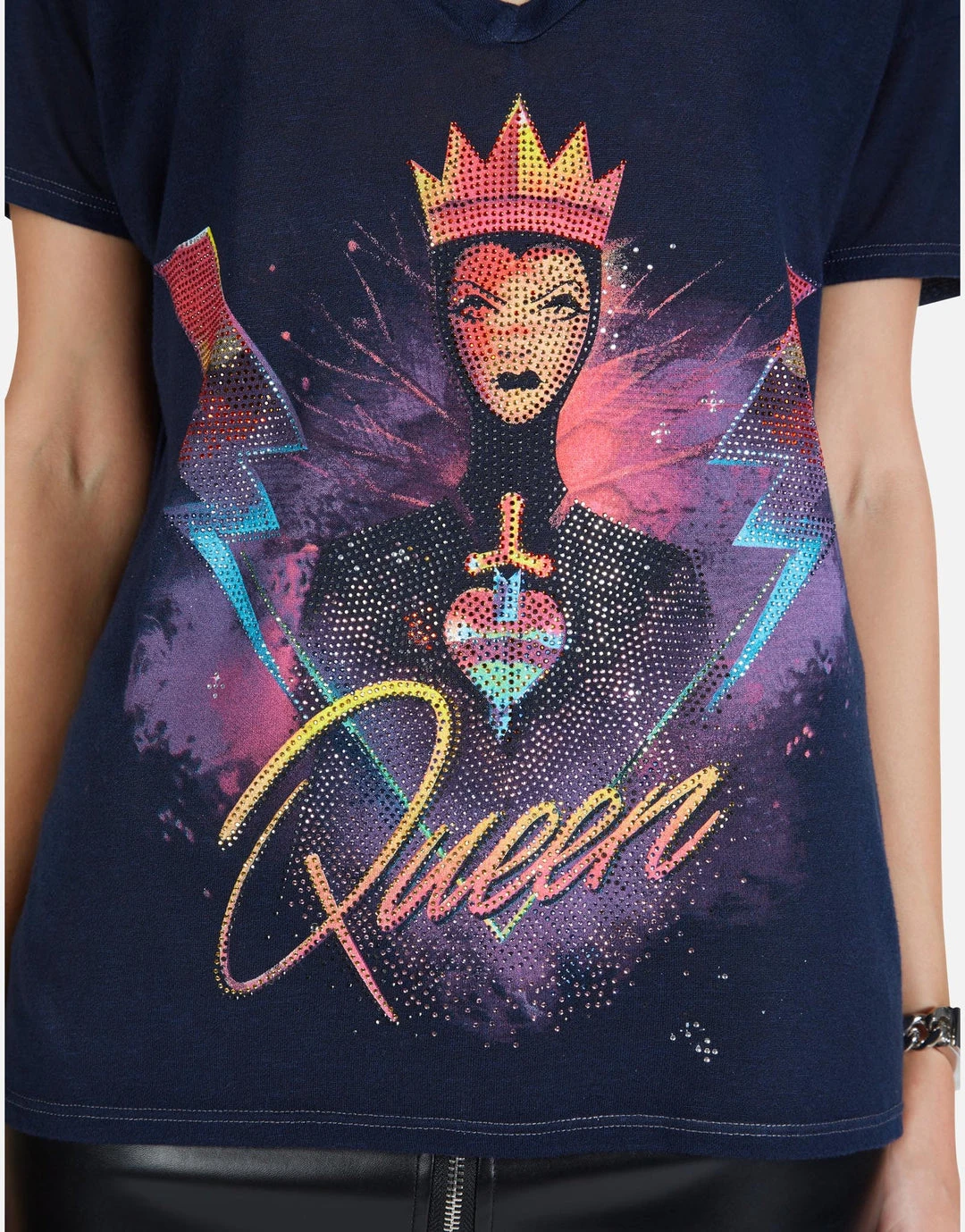 Disney Villains – Queen Printed on Super Soft Lightweight V-Neck Tee in Navy w/ Crystals by Lauren Moshi.