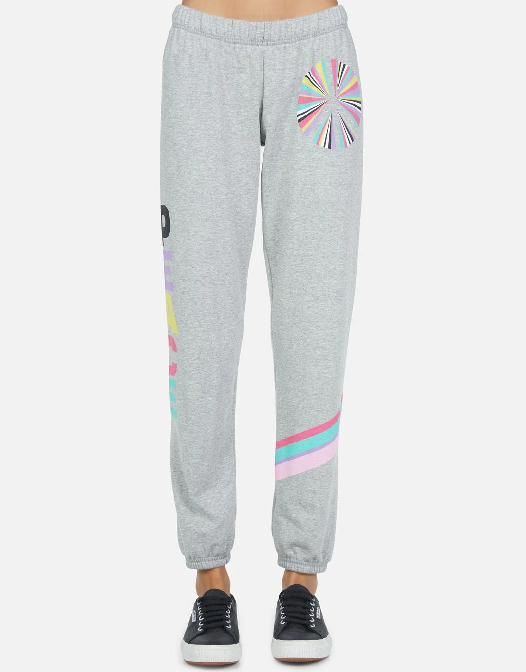 Rainbow Ray Peace Printed on Ultra Soft Lightweight Sweatpant in Heather Grey by Lauren Moshi.