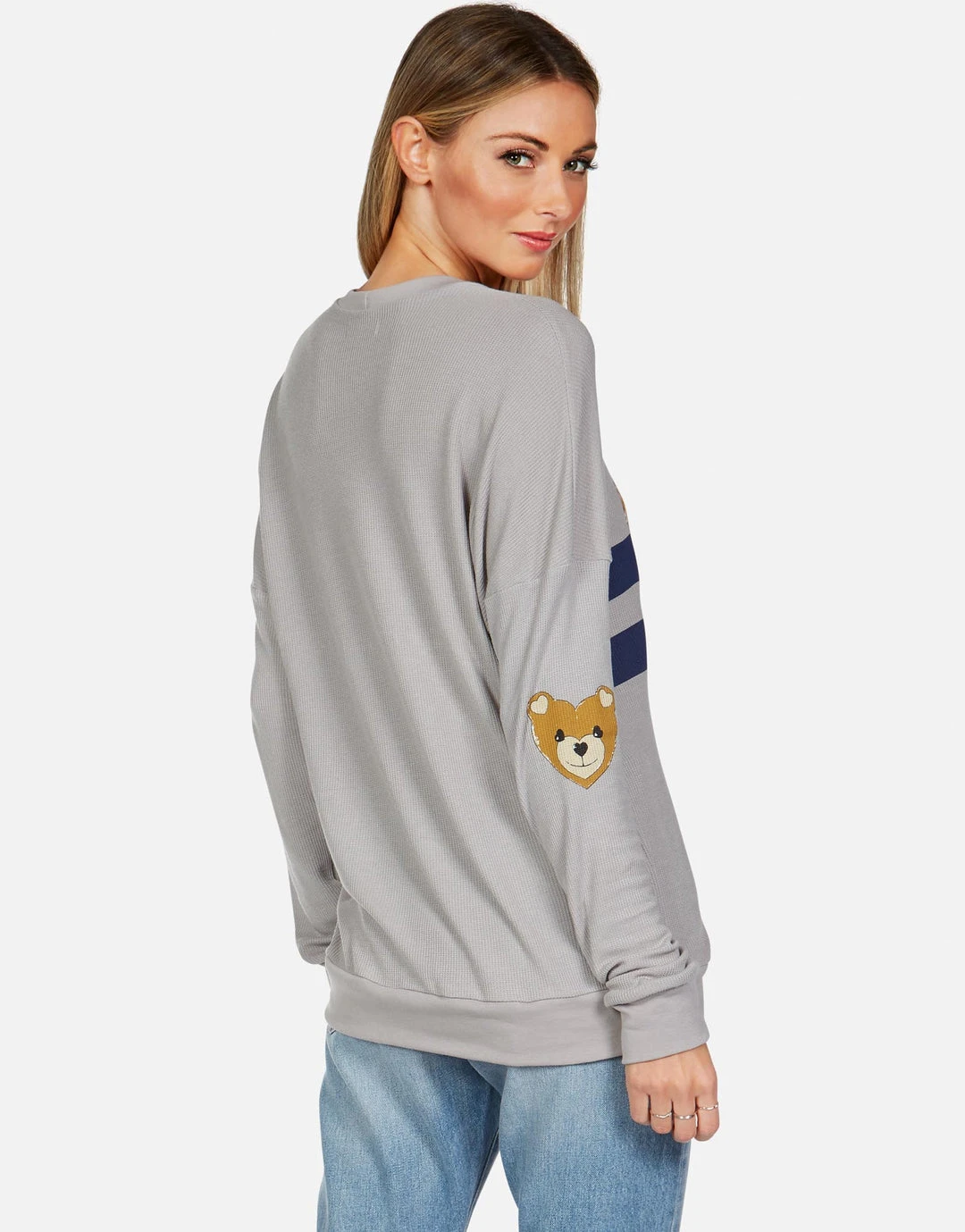 Stripe Heart Teddy Printed on Ultra Soft Lightweight Thermal in Heather Grey by Lauren Moshi.