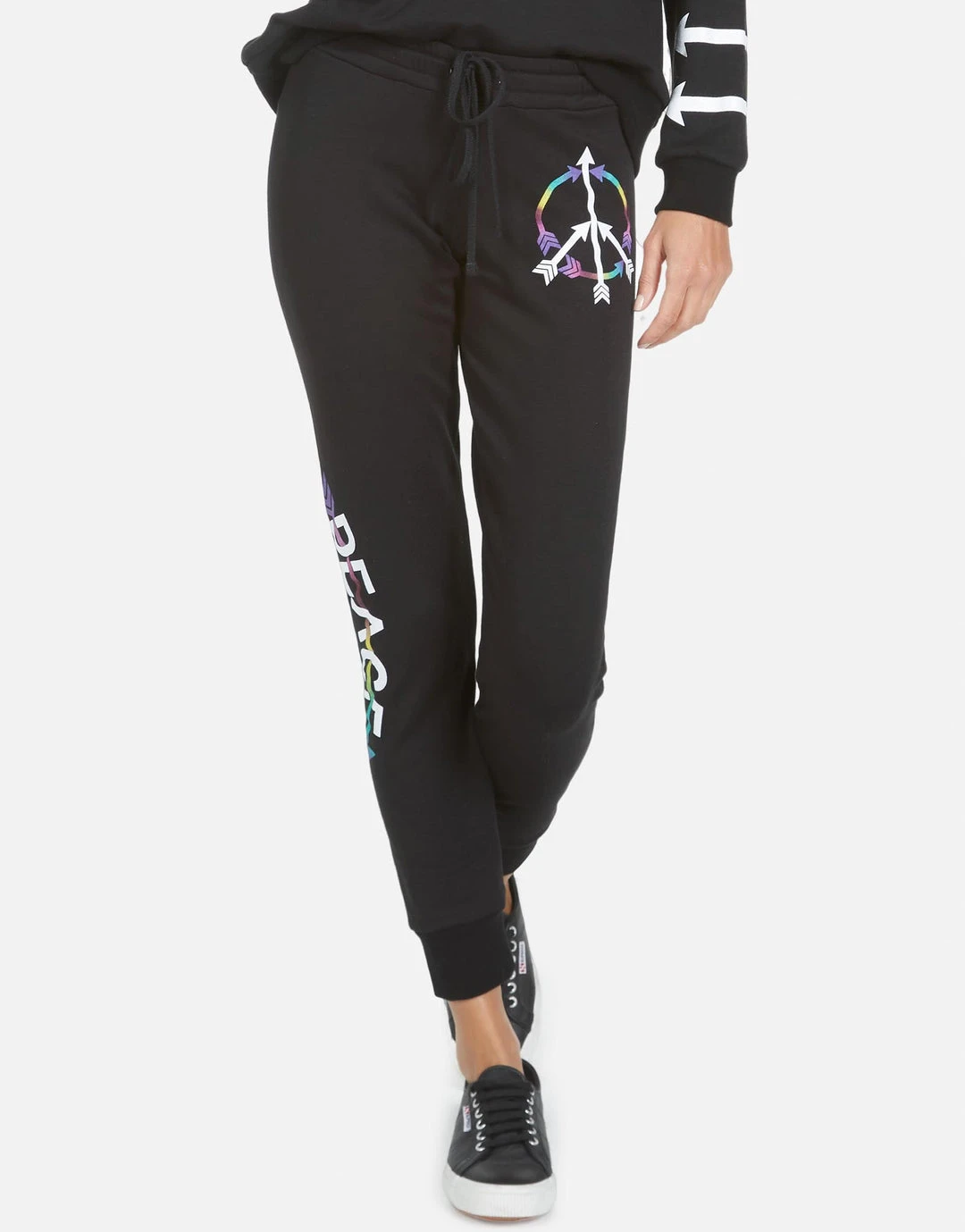 Peace Arrow Printed on Ultra Soft Lightweight Sweatpant in Black by Lauren Moshi.