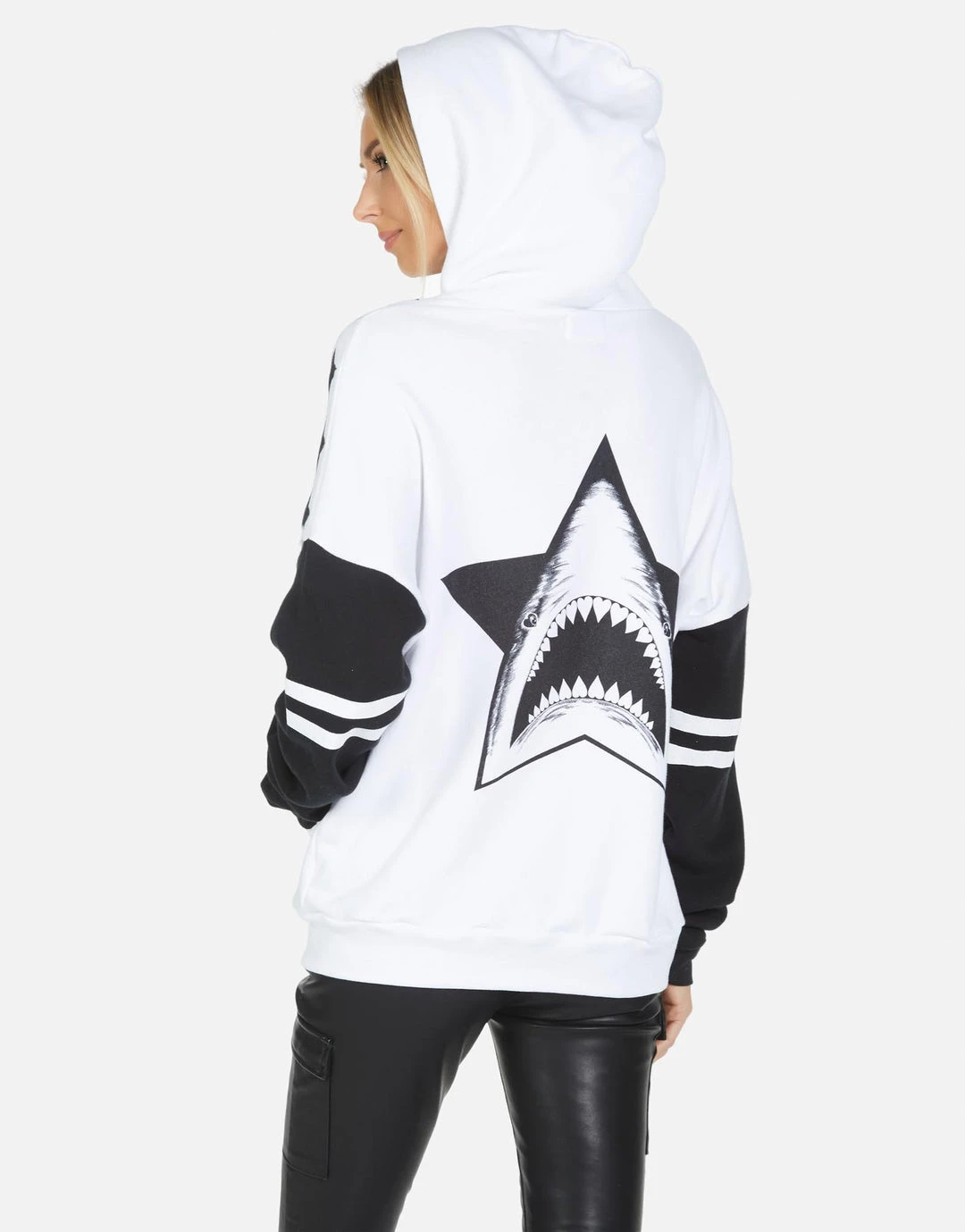 Star Shark Printed on Ultra Soft Lightweight Hoodie in White/Black by Lauren Moshi.