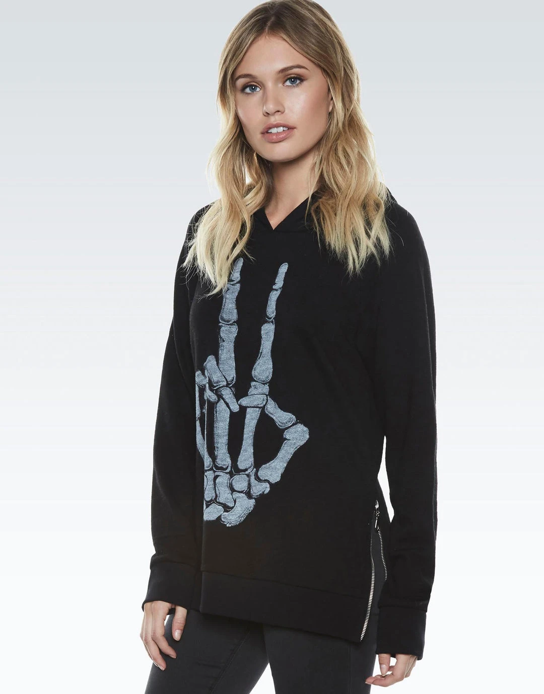 Skeleton Peace Printed on Ultra Soft Pullover Hoodie in Black by Lauren Moshi.