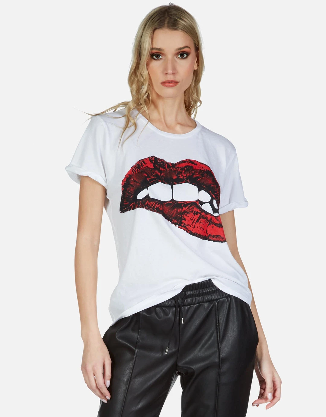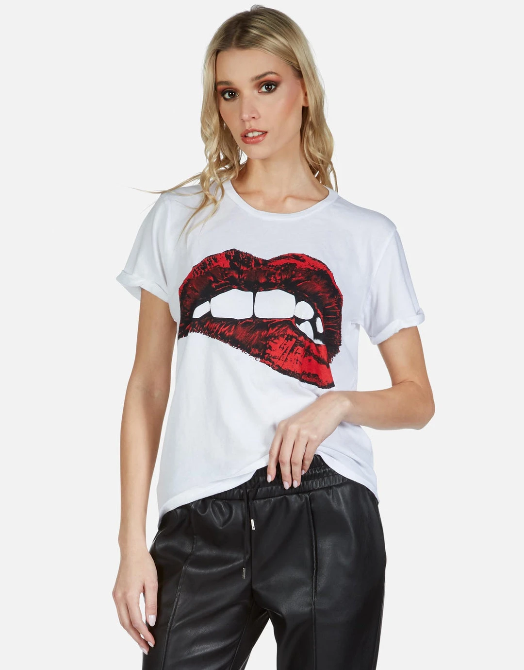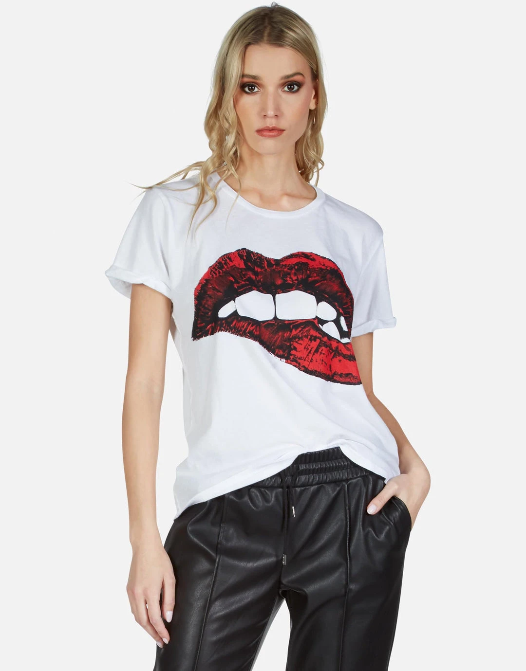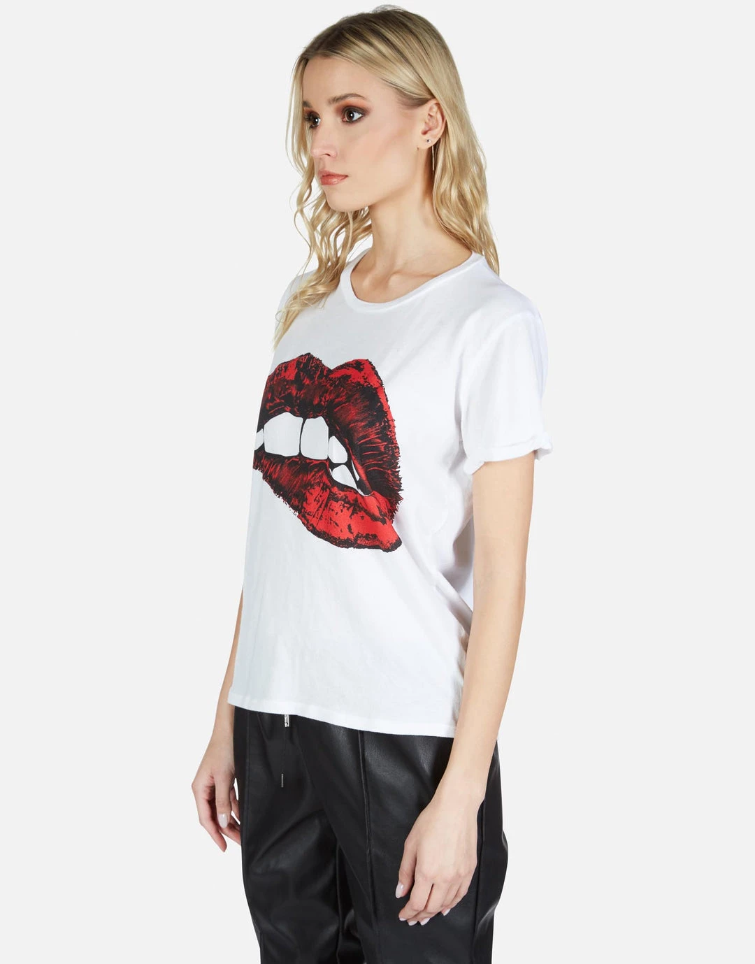 Biting Lip Printed on Ultra Soft Lightweight Tee in White by Lauren Moshi.