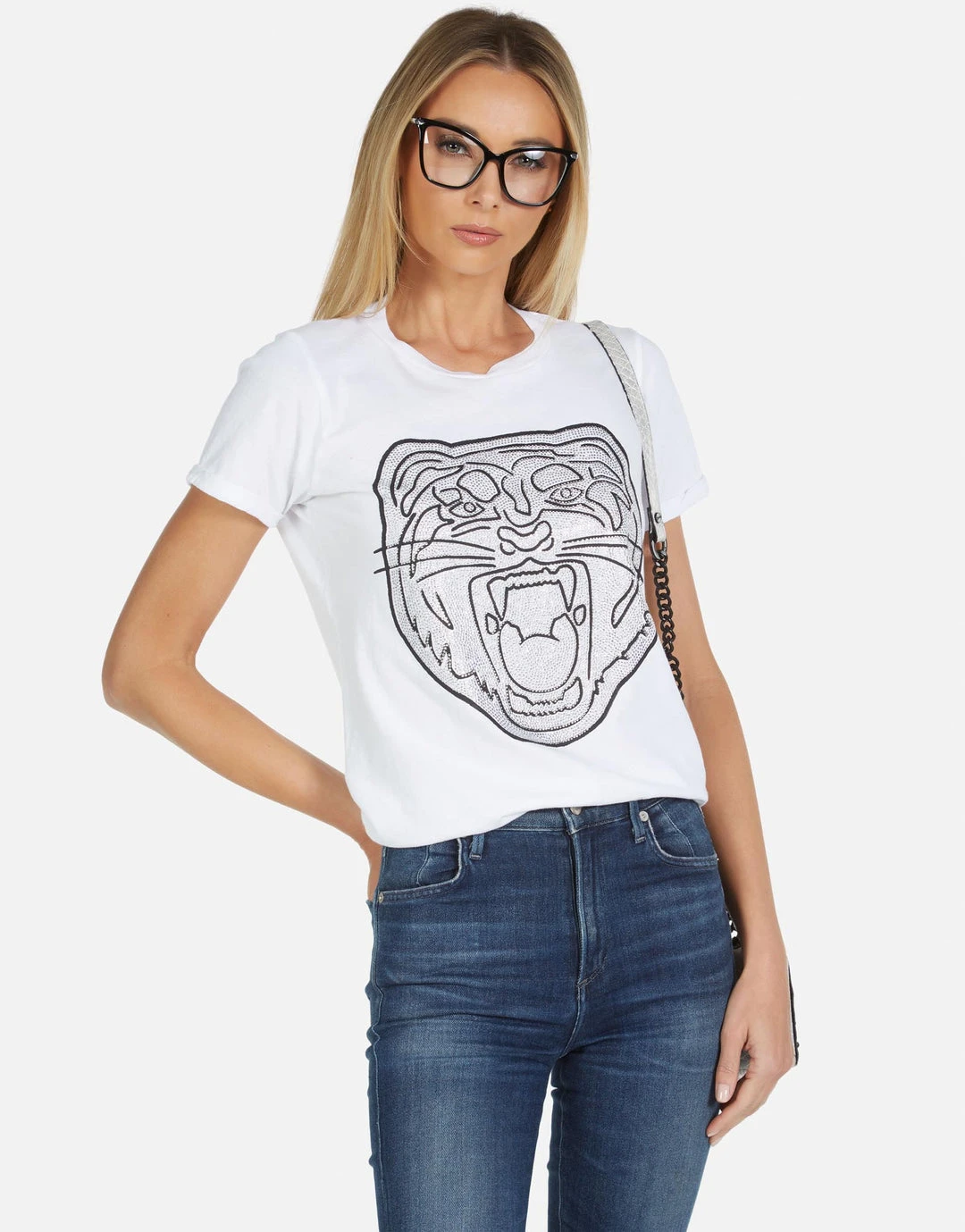 Crystal Tiger Head on Ultra Soft Lightweight Tee in White by Lauren Moshi.