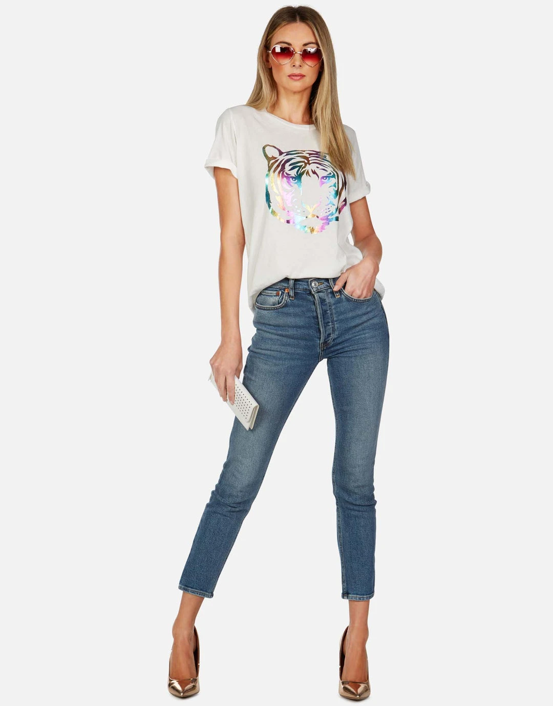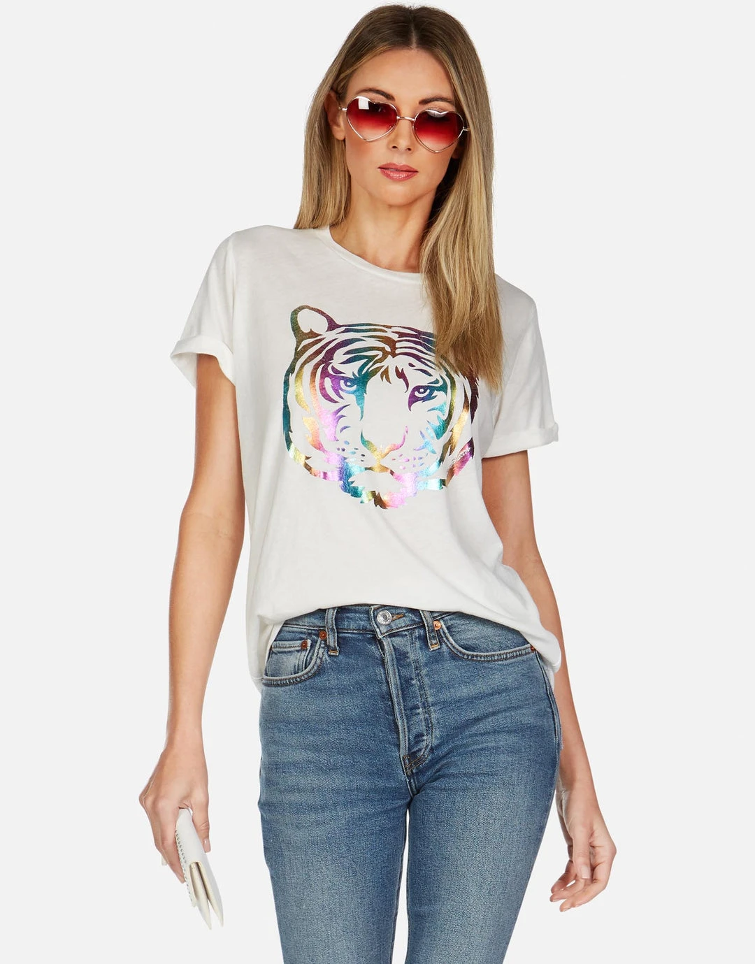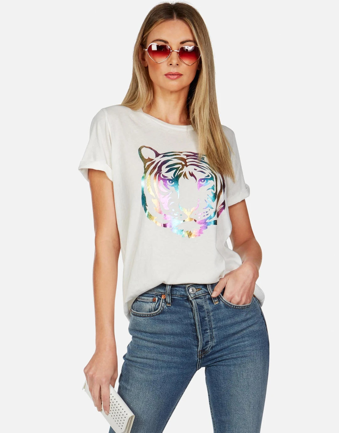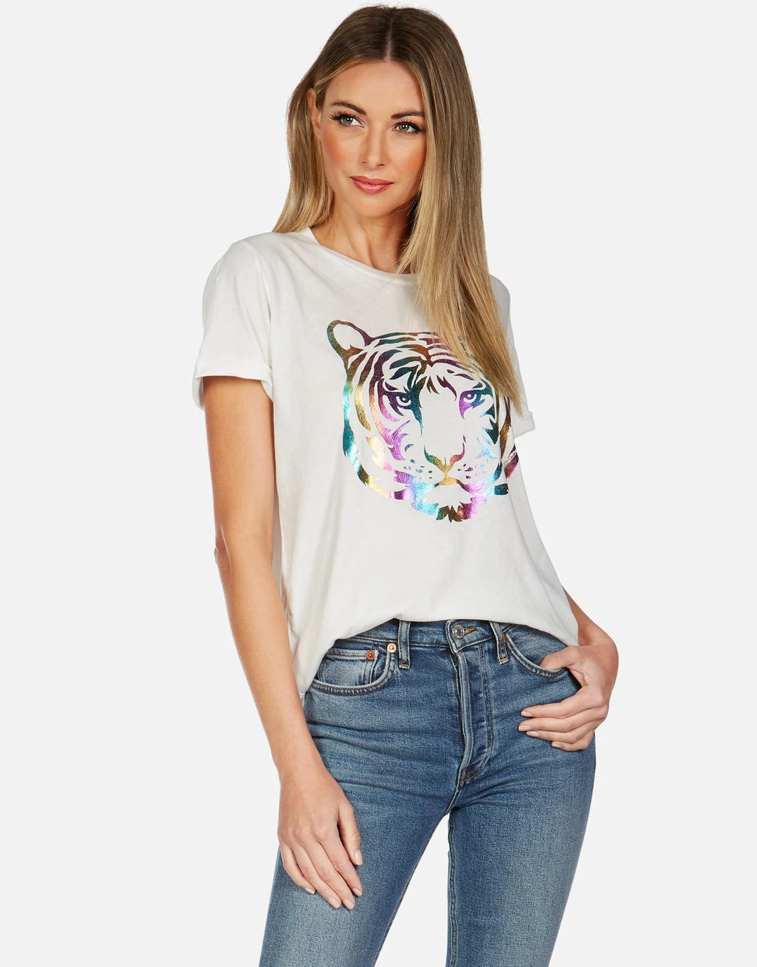 Neon Tiger Face Printed on Ultra Soft Lightweight Vintage Tee in Milk by Lauren Moshi.