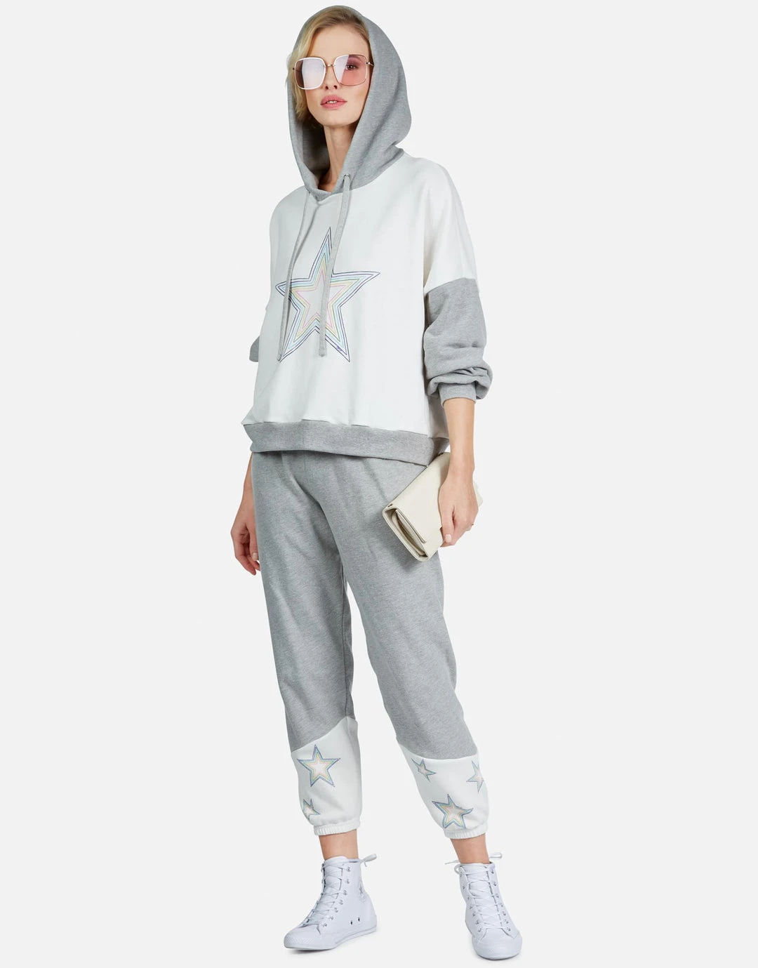 Rainbow Star Outline Printed on Ultra Soft Lightweight Pullover Hoodie in Milk/Heather Grey by Lauren Moshi.