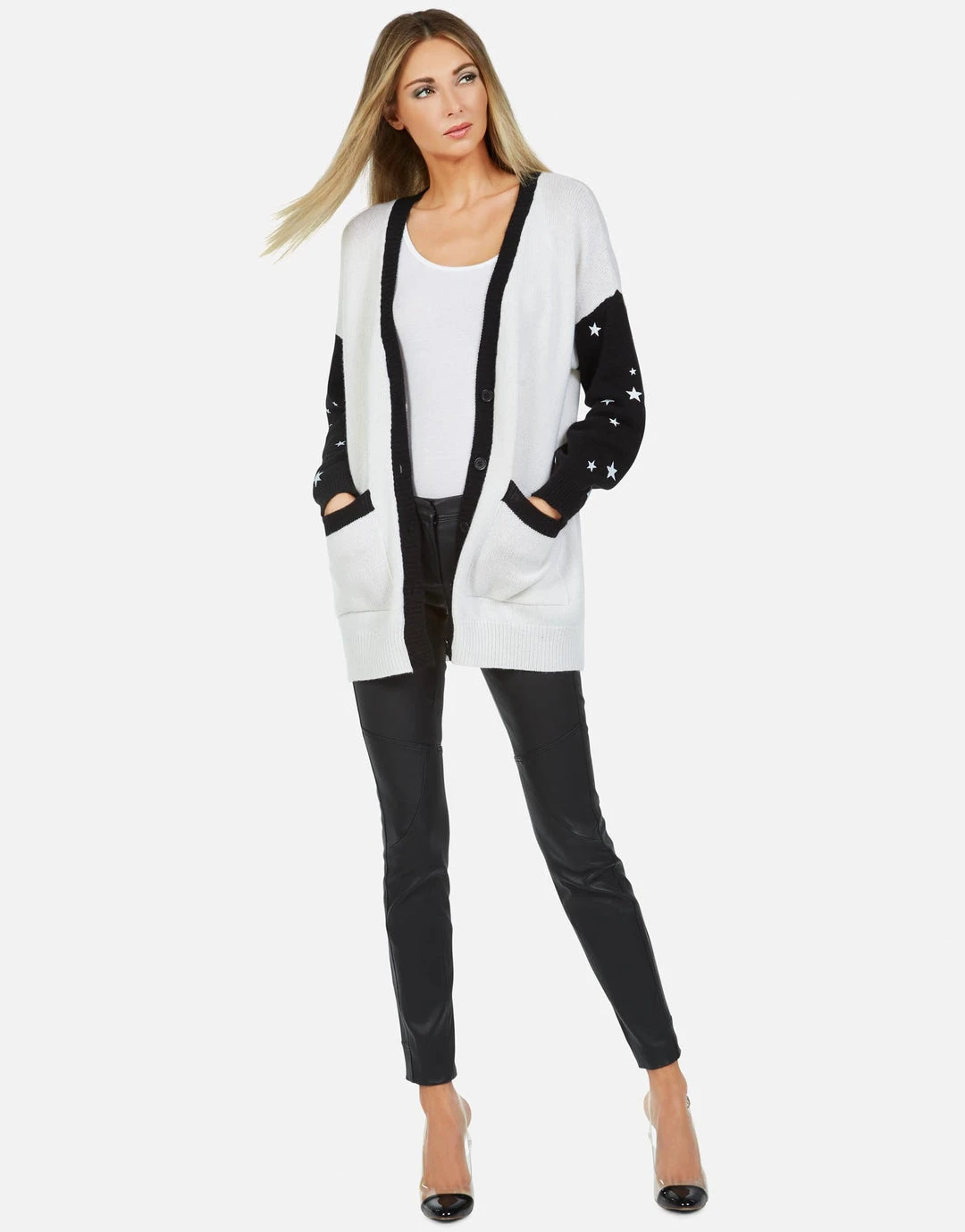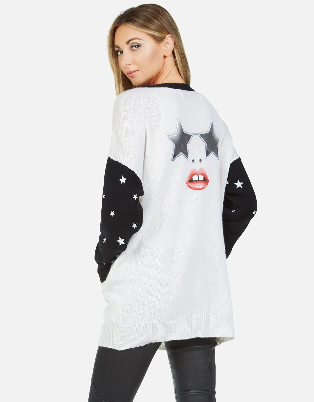 Star Glam Face Printed on Ultra Soft Lightweight Cashmere Cardigan in Creme/Black by Lauren Moshi.