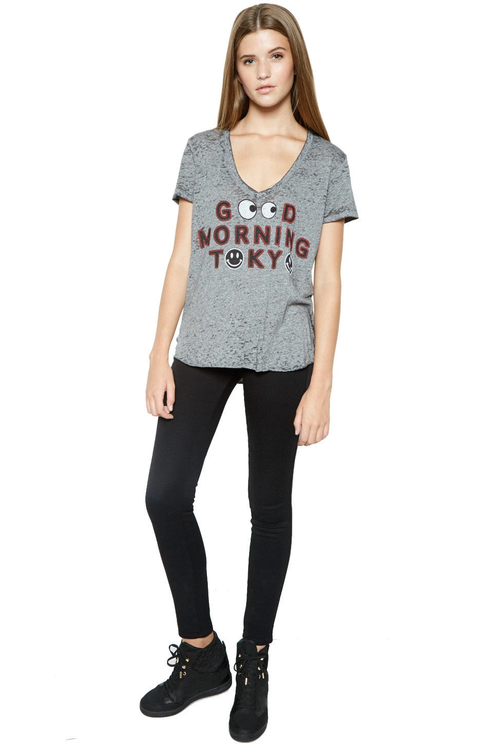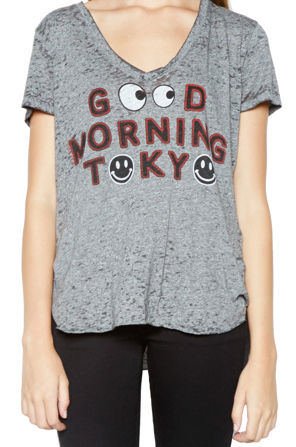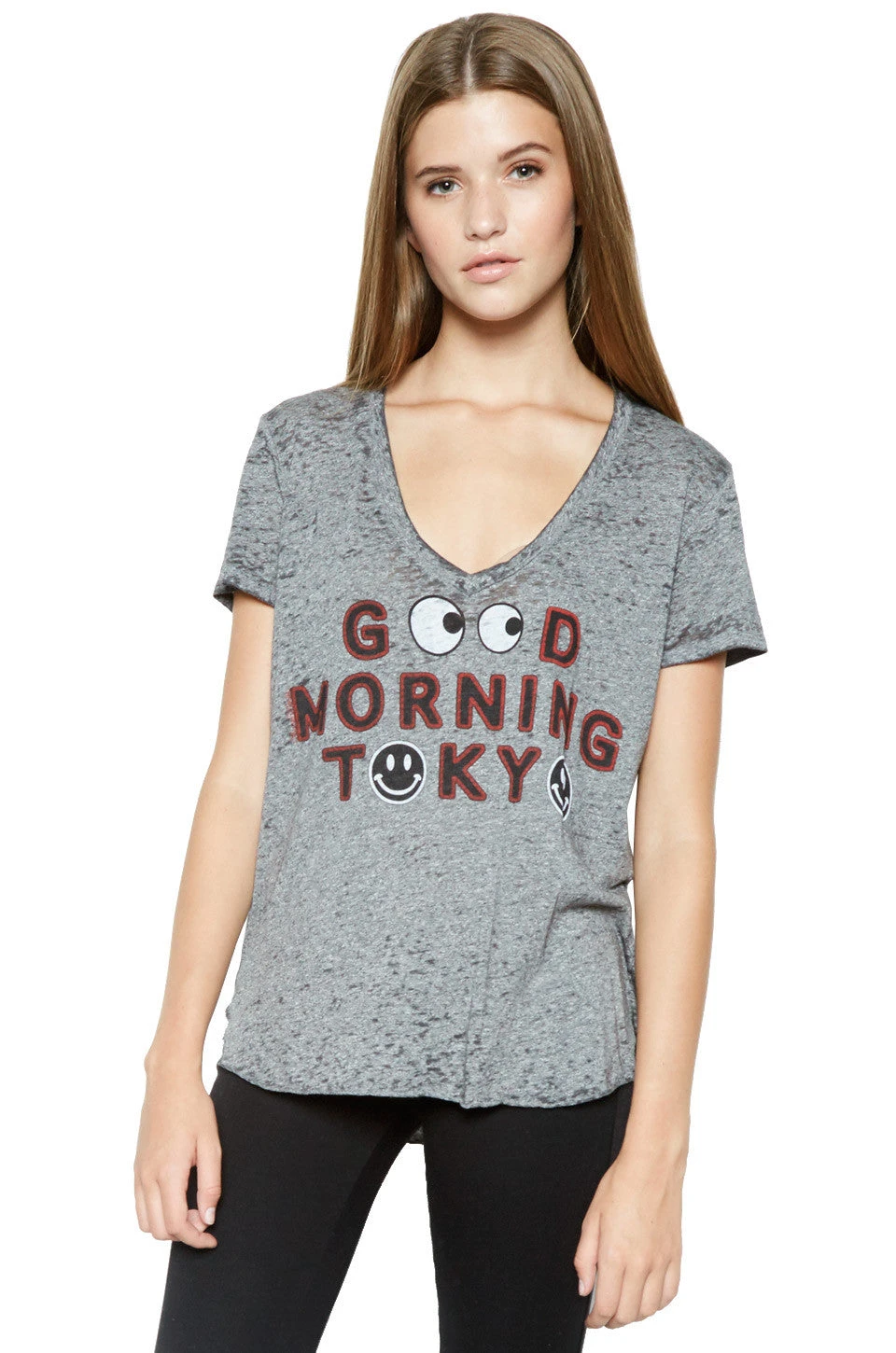 Emmalyn Good Morning Tokyo Printed on Ultra Soft Lightweight Tee in Heather Grey by Lauren Moshi.