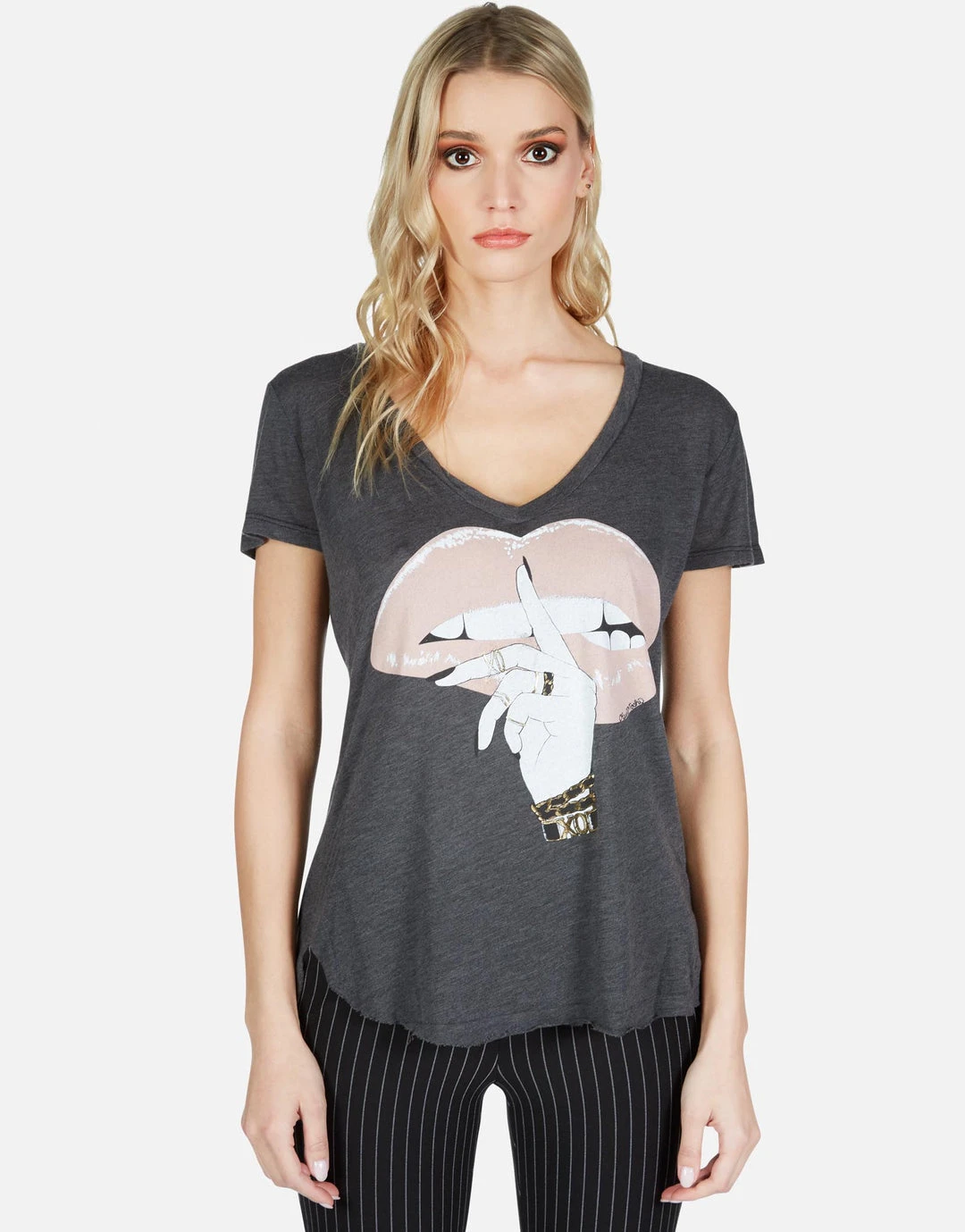 XO Shh Lip Printed on Ultra Soft Lightweight Tee in Dark Grey Heather by Lauren Moshi.