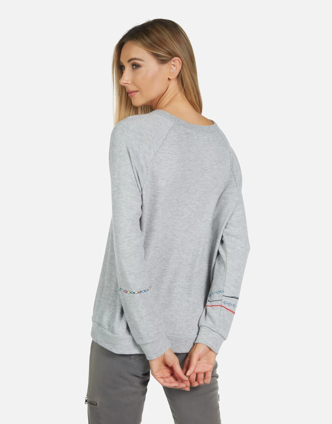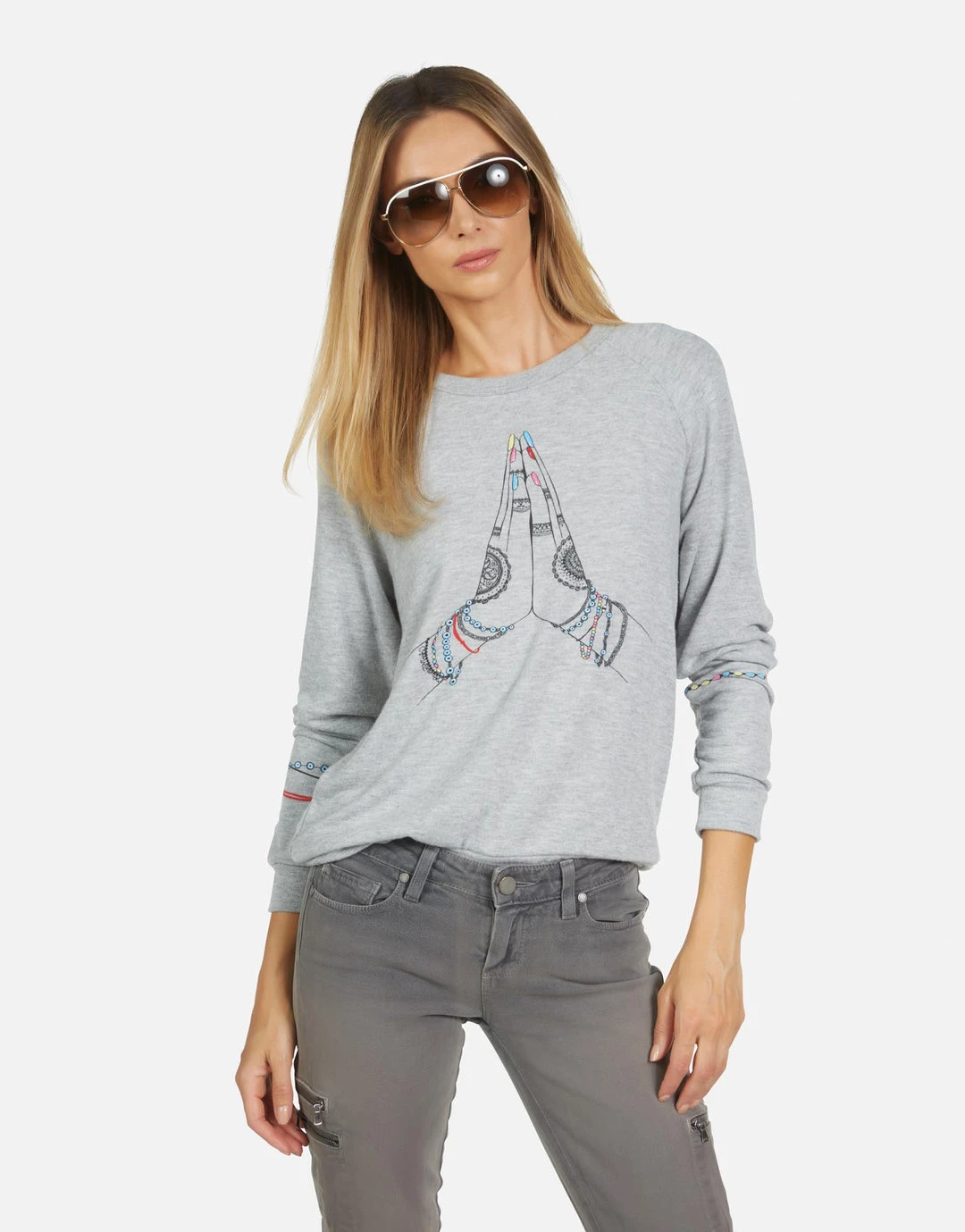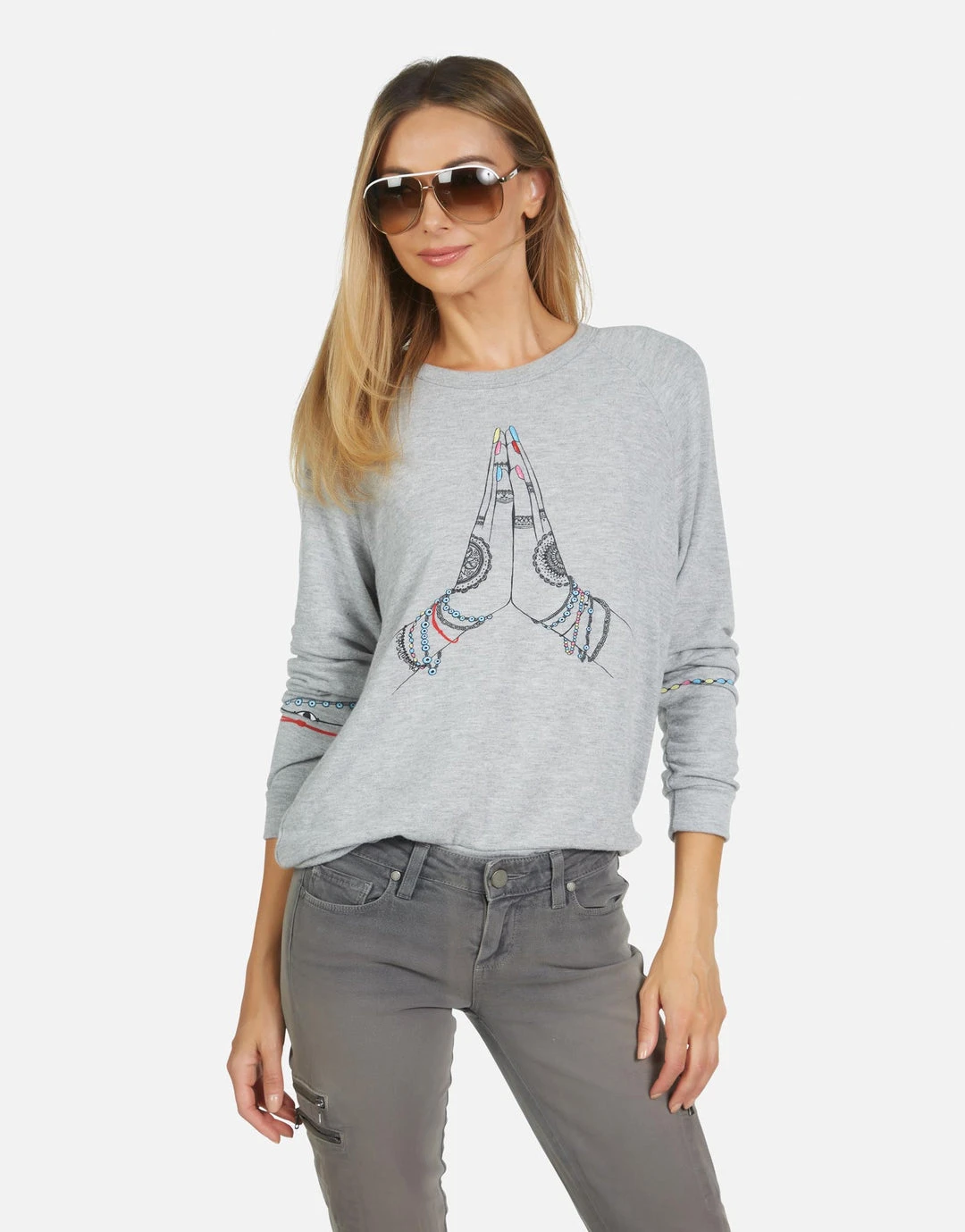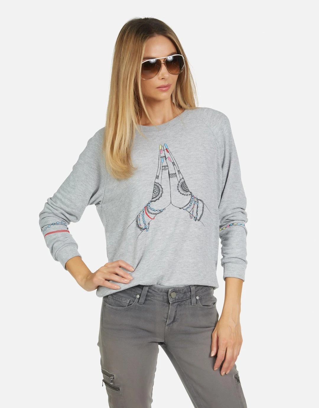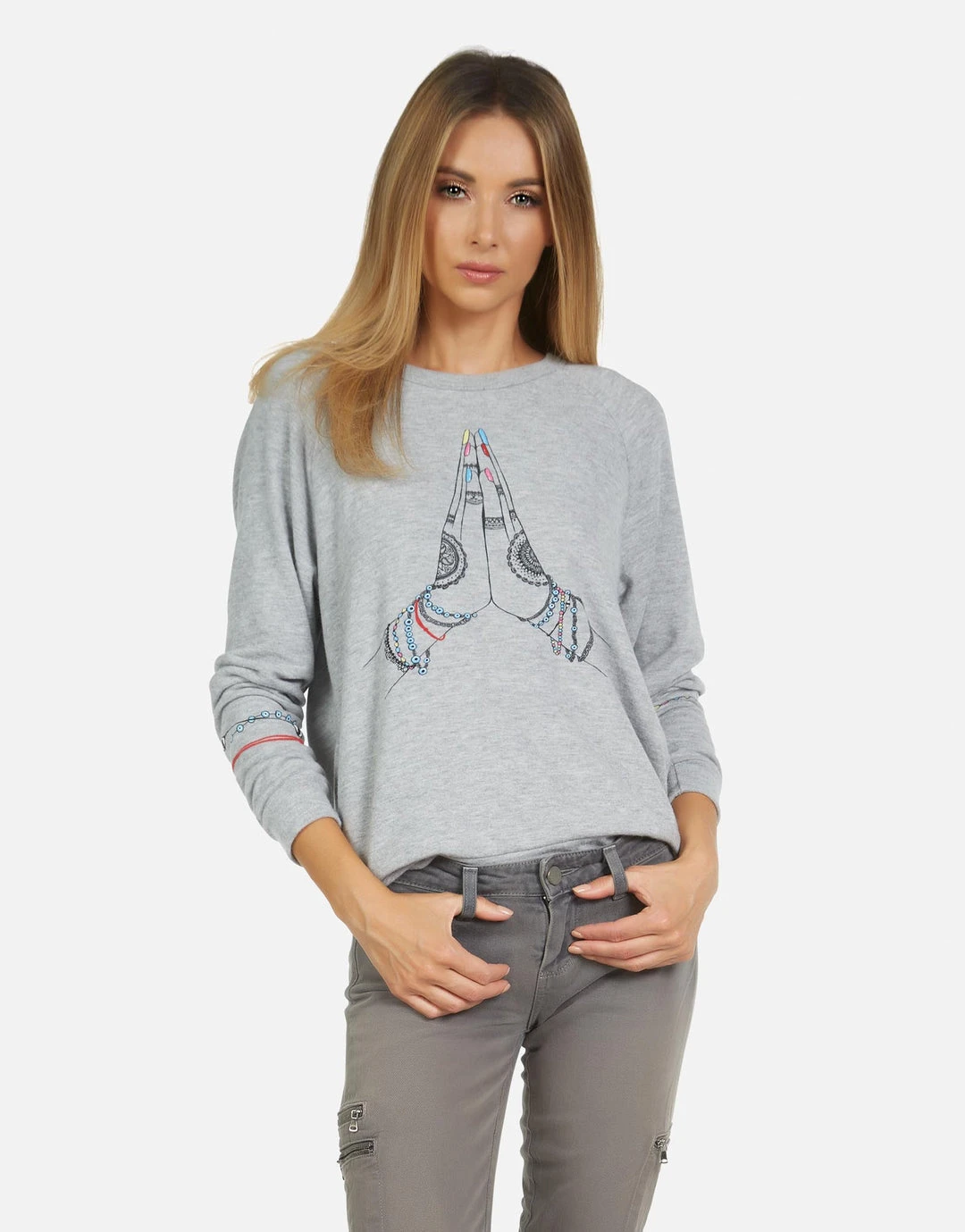 Prayer Hands Printed on Ultra Soft Lightweight Pullover in Heather Grey by Lauren Moshi.