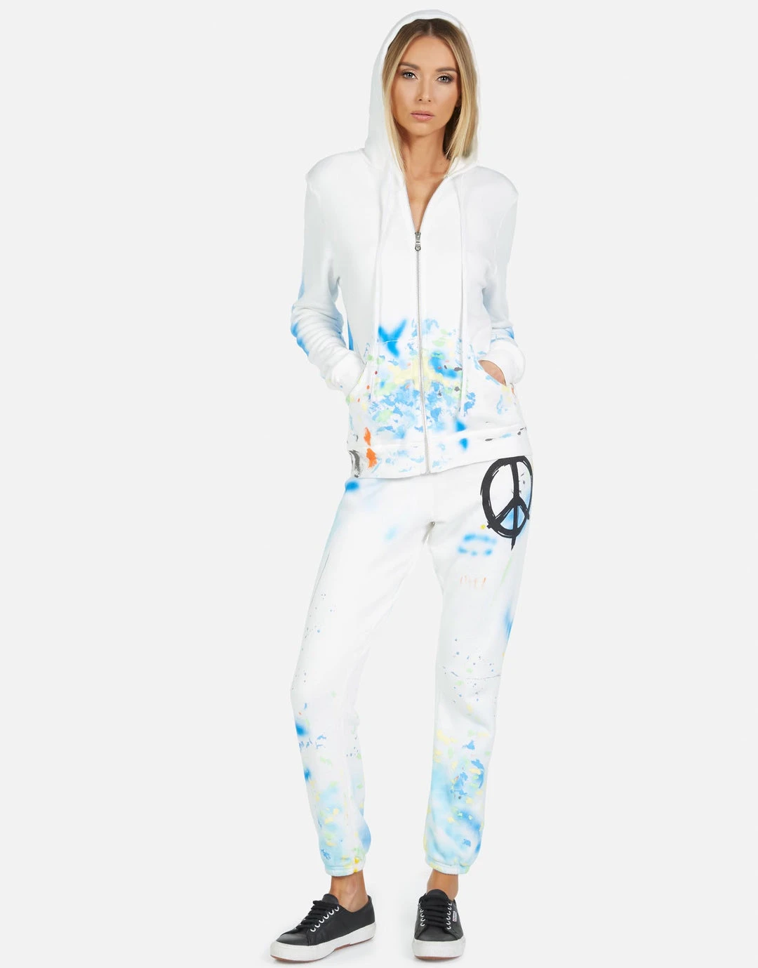 Brush Peace on Ultra Soft Lightweight Sweatpant in White/Paint Splatter by Lauren Moshi.
