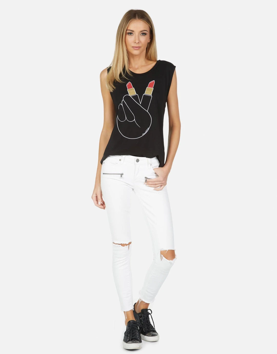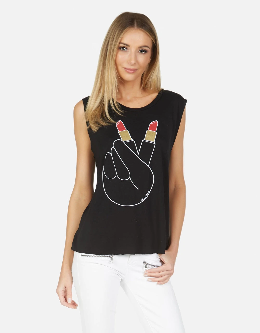 Lipstick Peace Printed on Ultra Soft Lightweight Muscle Tank in Black by Lauren Moshi.