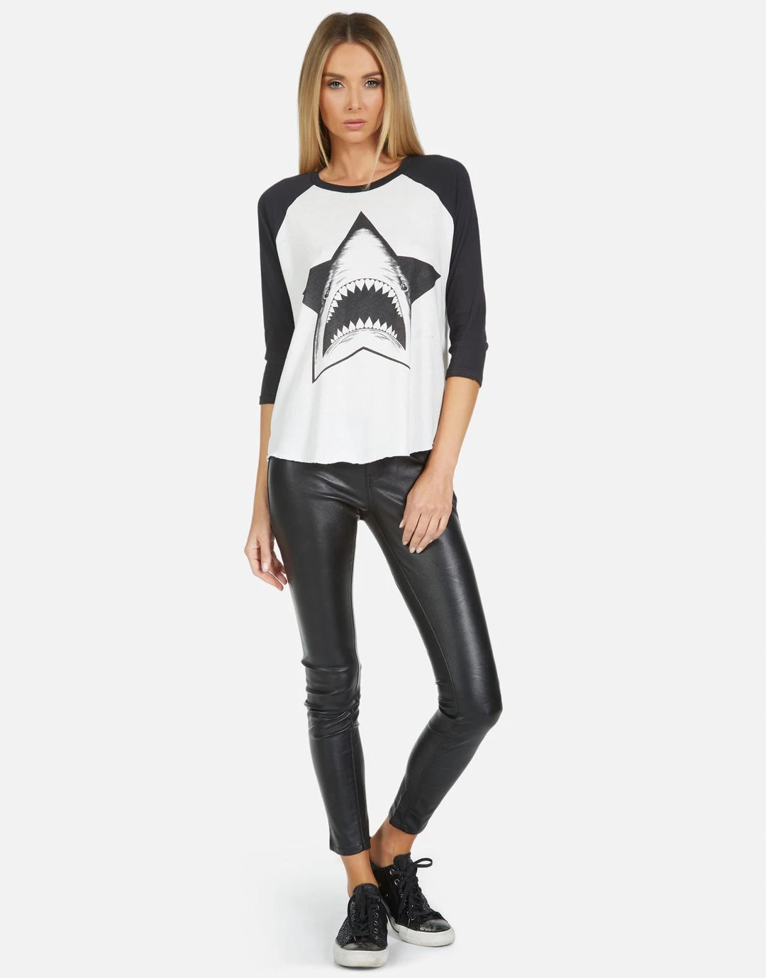 Star Shark Printed on Ultra Soft Lightweight Baseball Tee in Milk/Onyx by Lauren Moshi.