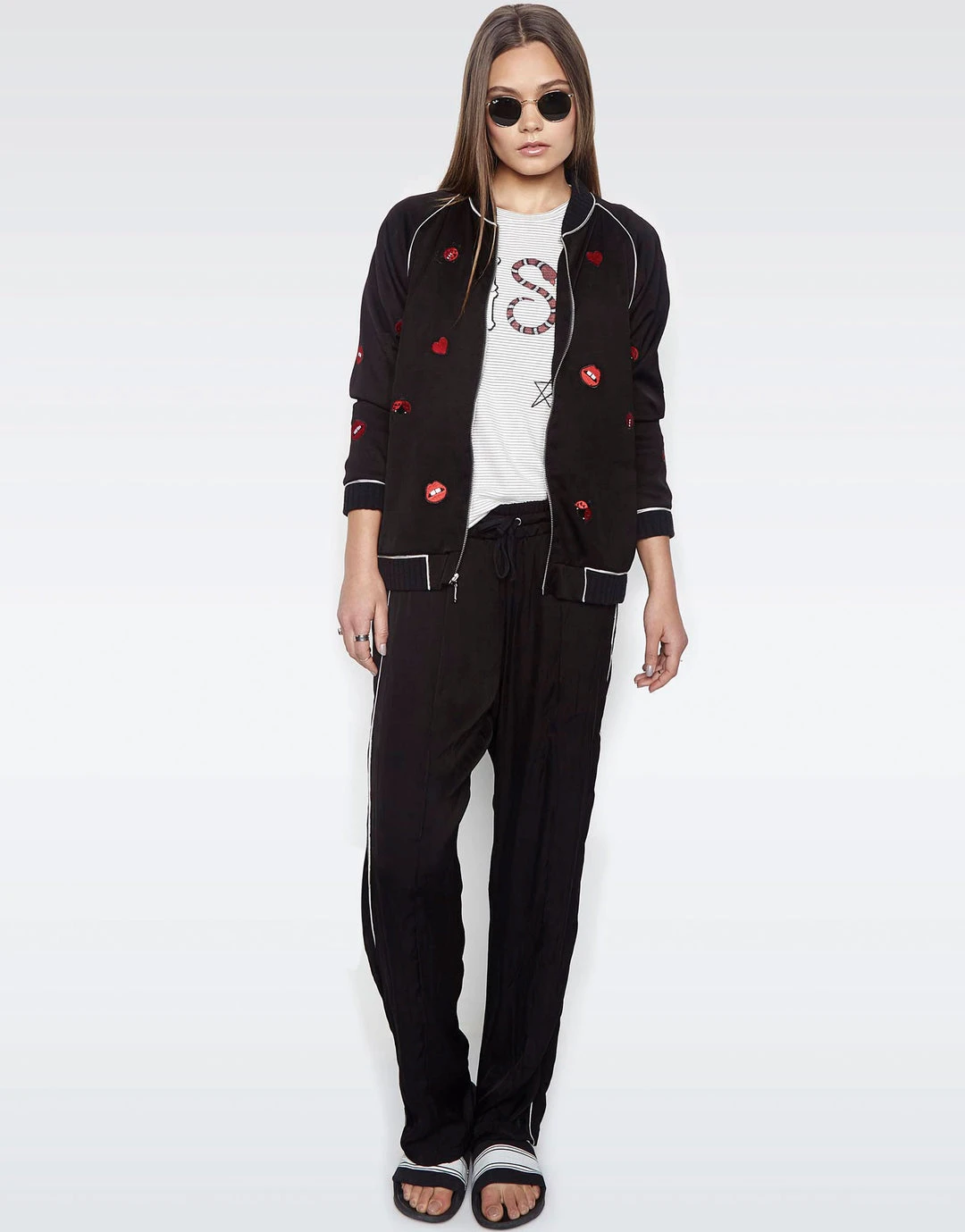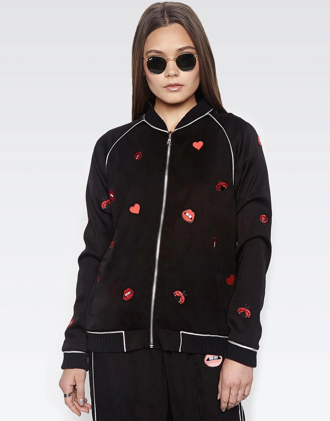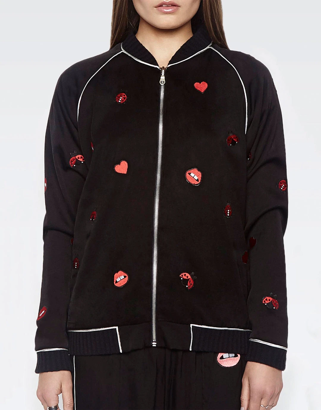 Ladybug & Love Kiss Patches Bomber Jacket w/Piping in Black by Lauren Moshi.