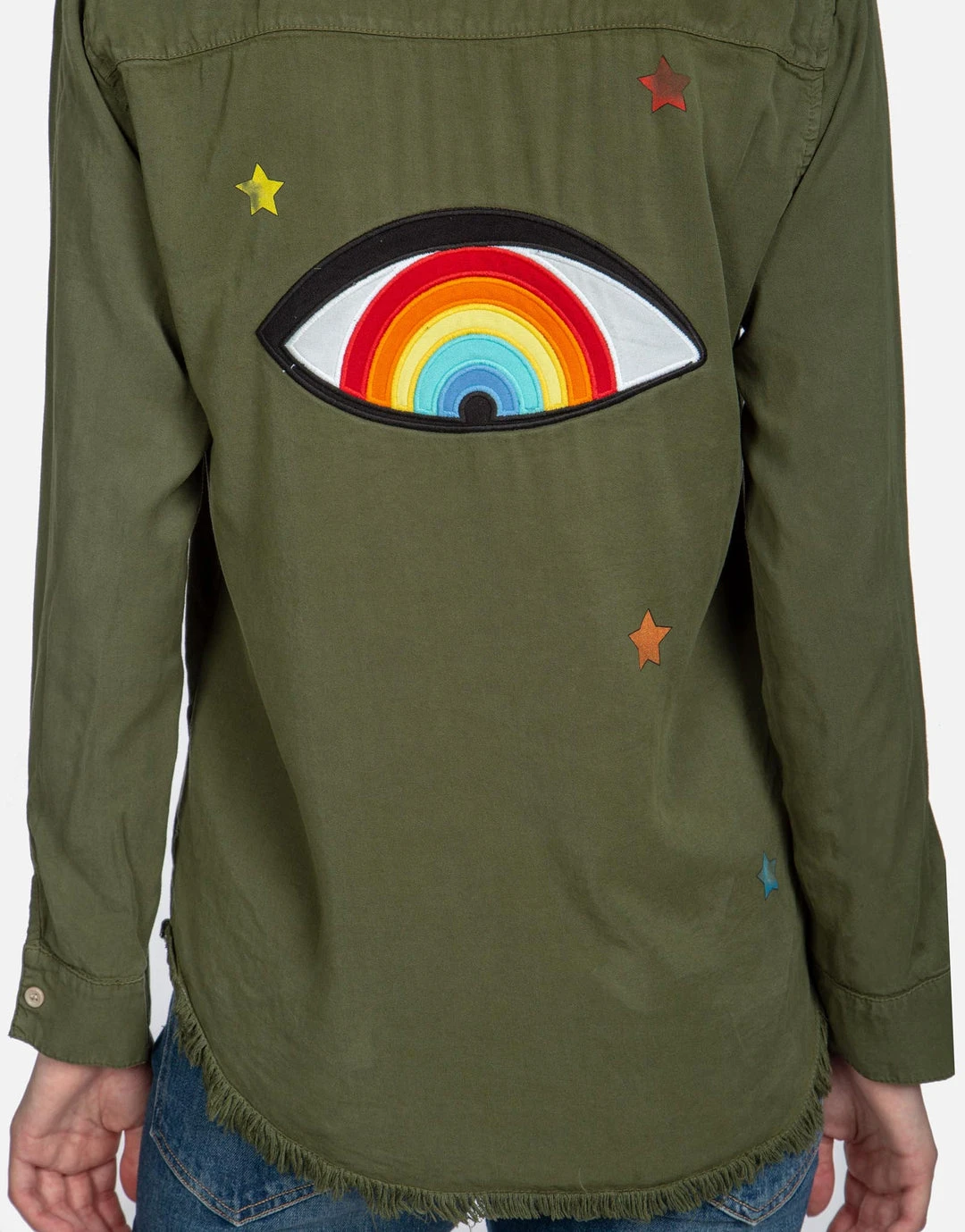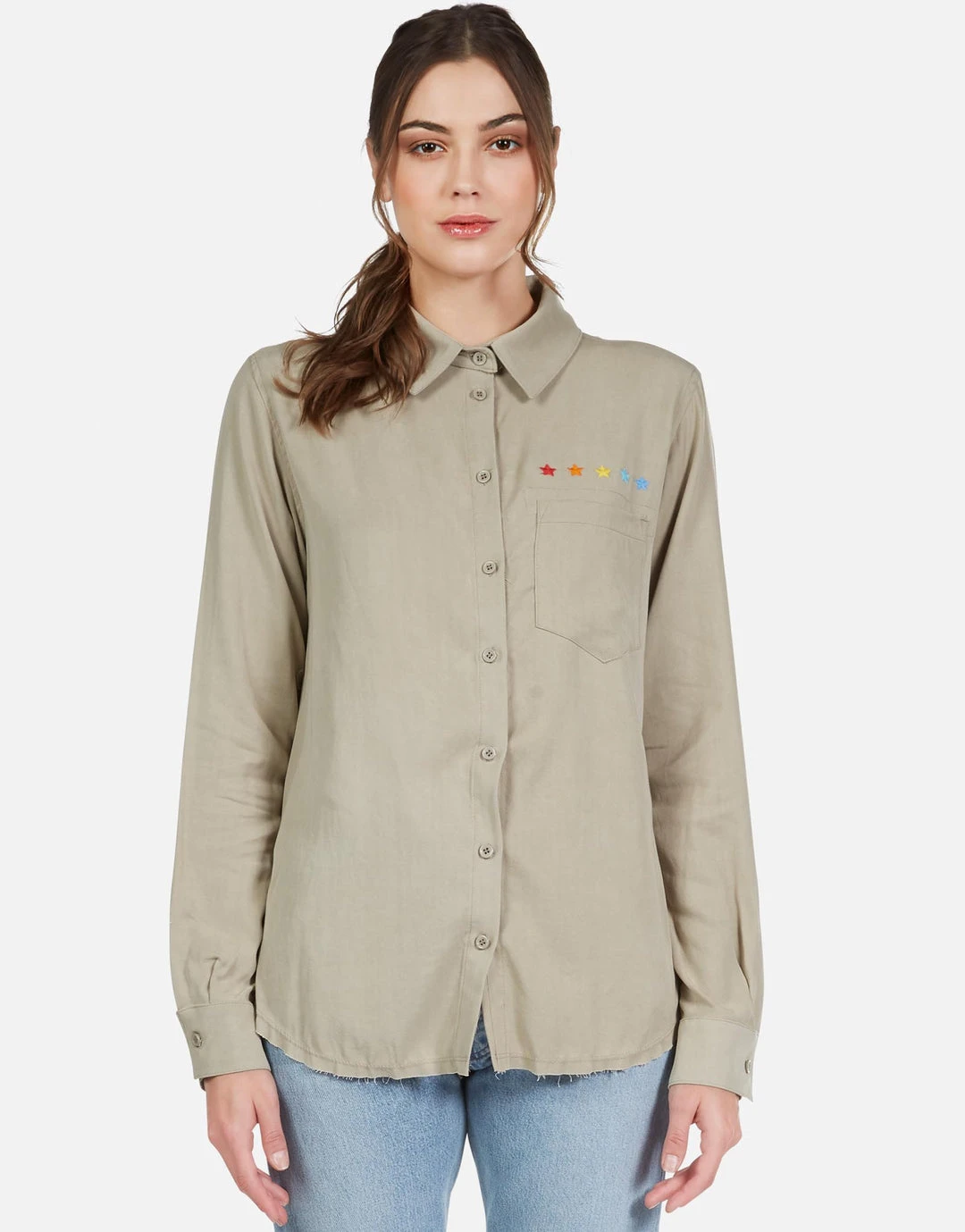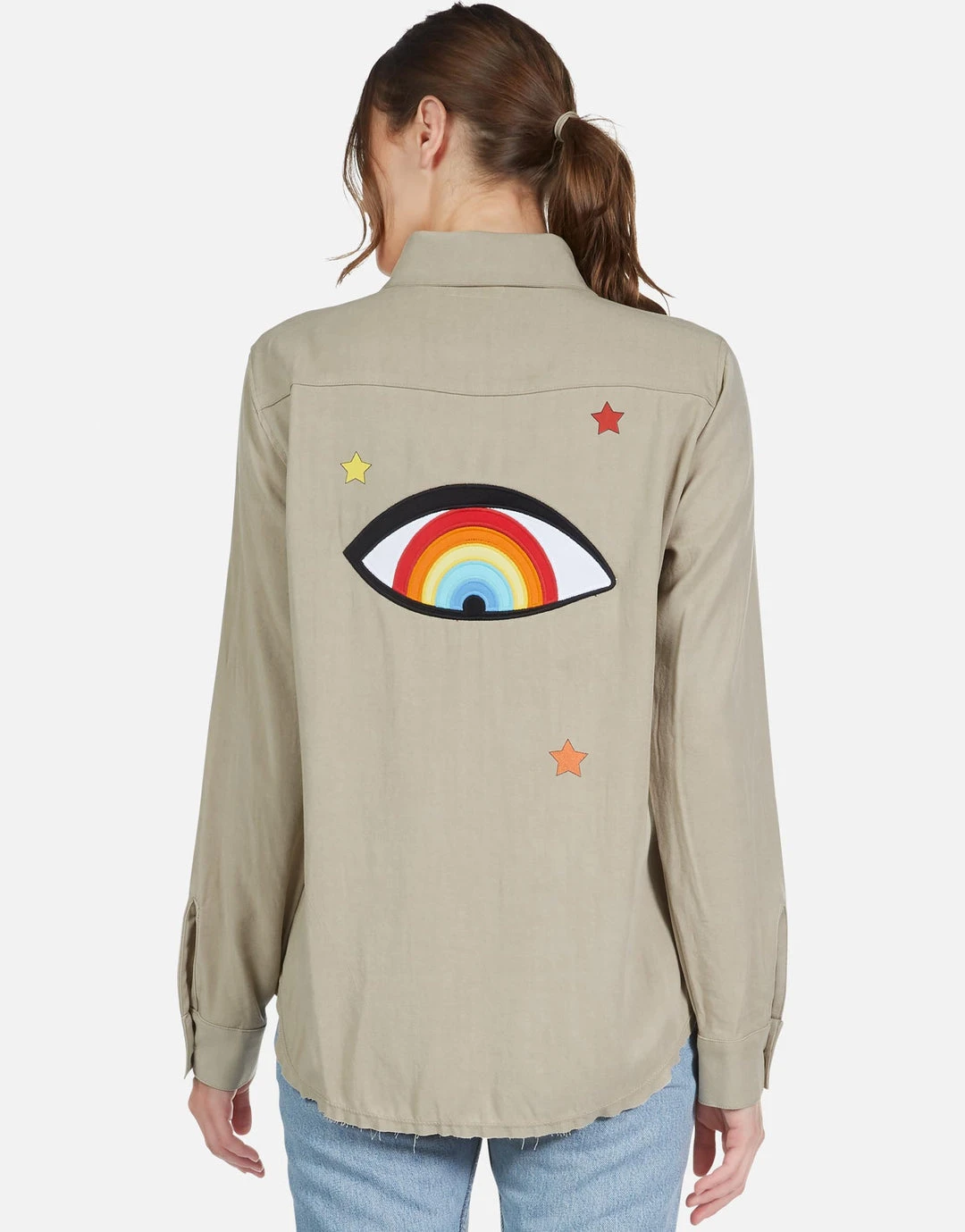 Rainbow Eye Embroidered on Super Soft Lightweight Button Up in Sand by Lauren Moshi.