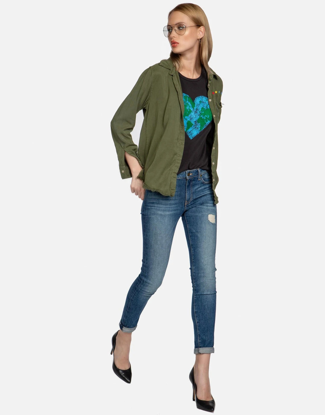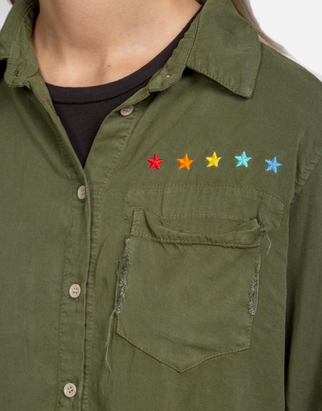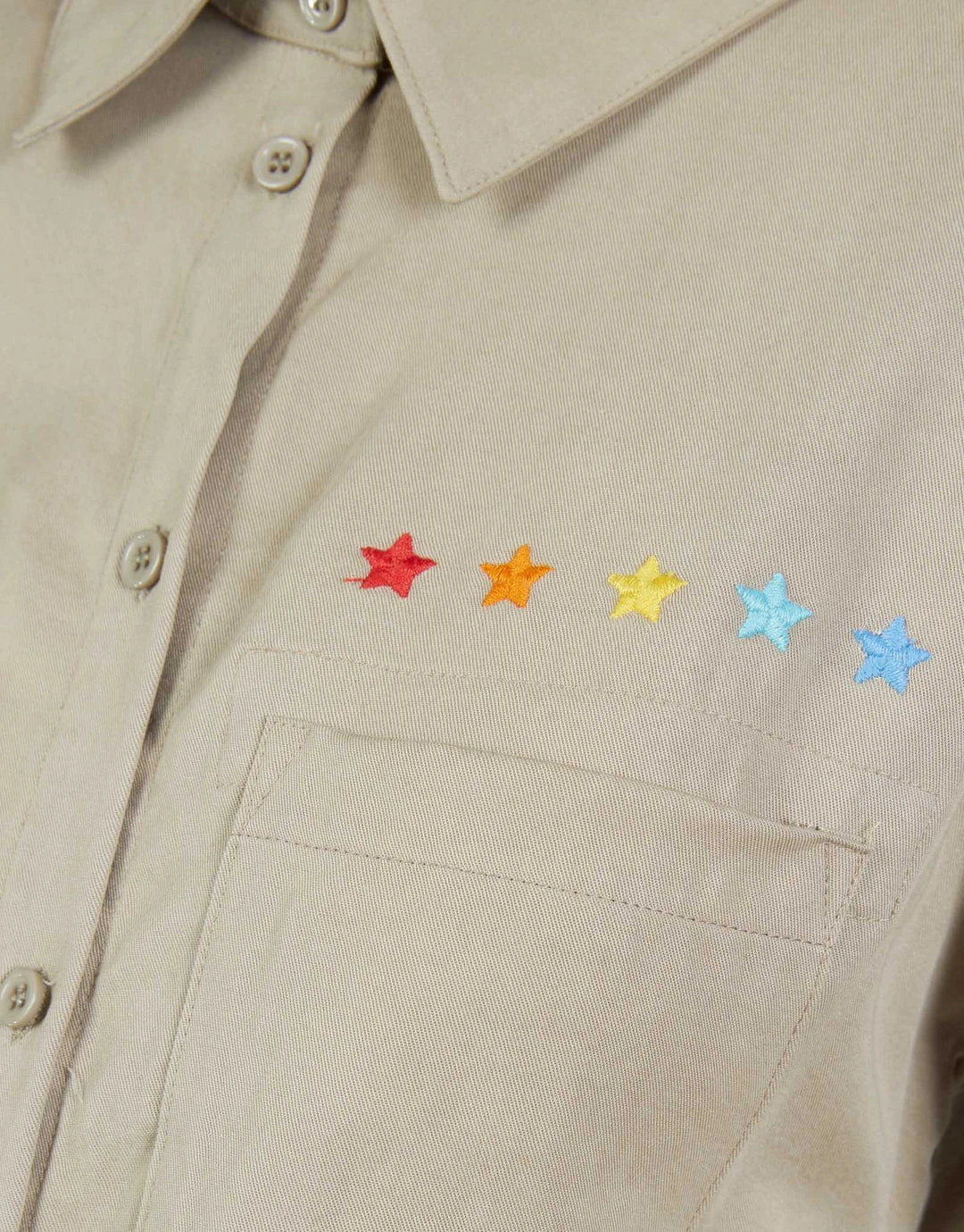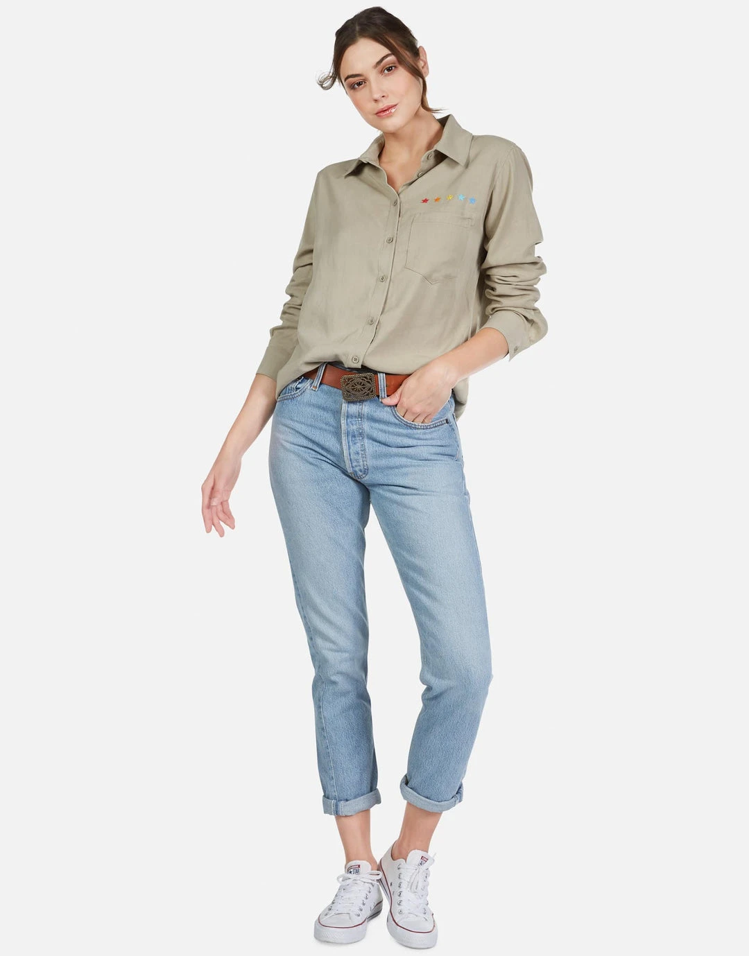 Rainbow Eye Embroidered on Super Soft Lightweight Button Up in Sand by Lauren Moshi.