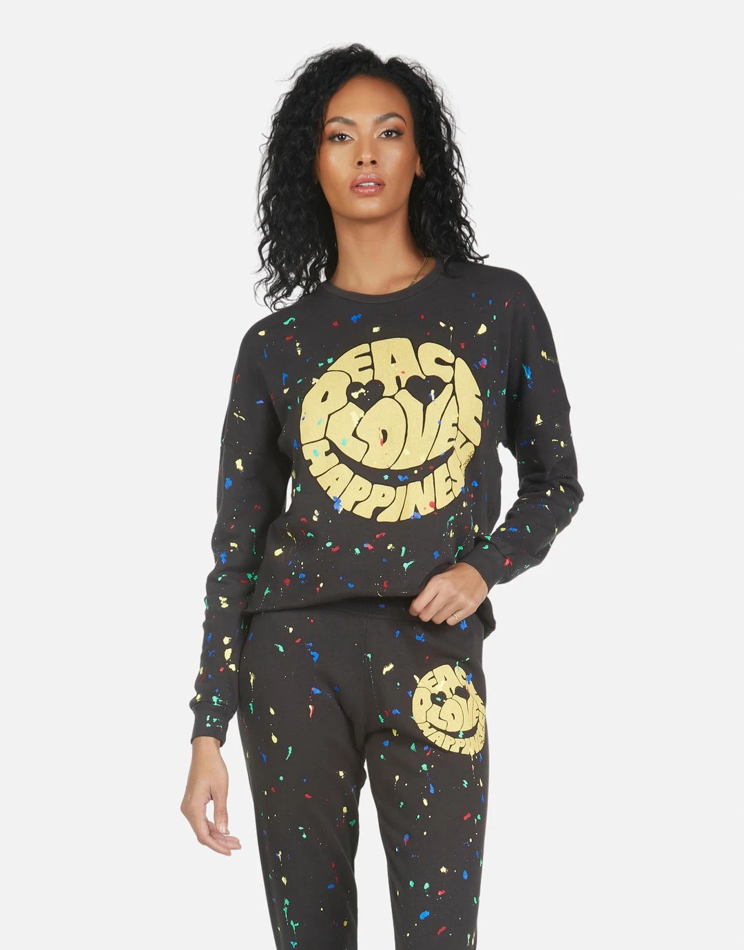 Text Happy Face Printed on Ultra Soft Lightweight Pullover in Onyx/Primary Splatter by Lauren Moshi.