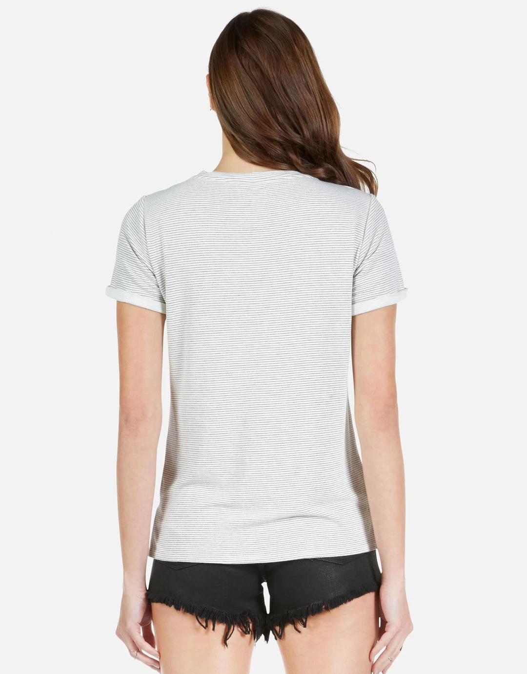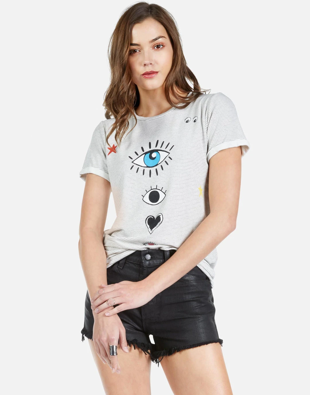 Cosmic Glam Eyes Printed on Ultra Soft Lightweight Tee in White / Black Stripe by Lauren Moshi.