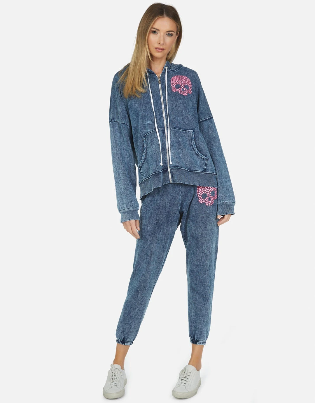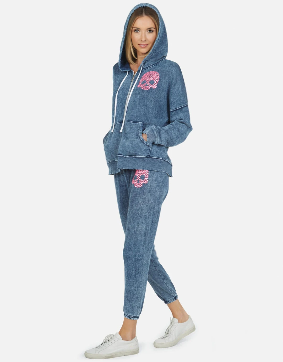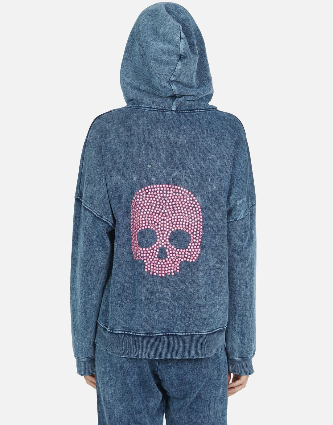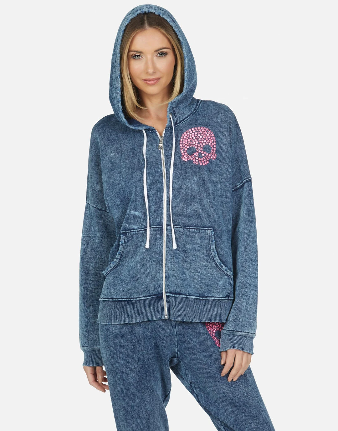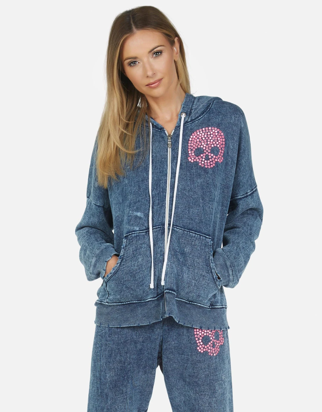 Pink Stud Skull Printed on Ultra Soft Lightweight Zip Up Hoodie in Indigo Mineral Wash by Lauren Moshi.