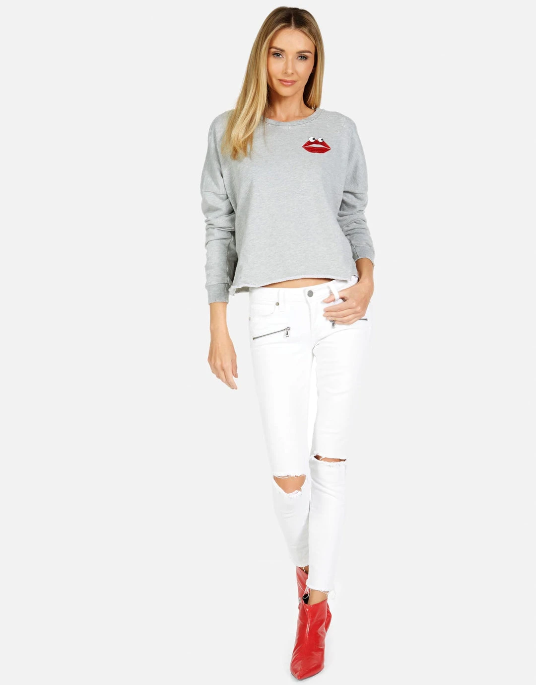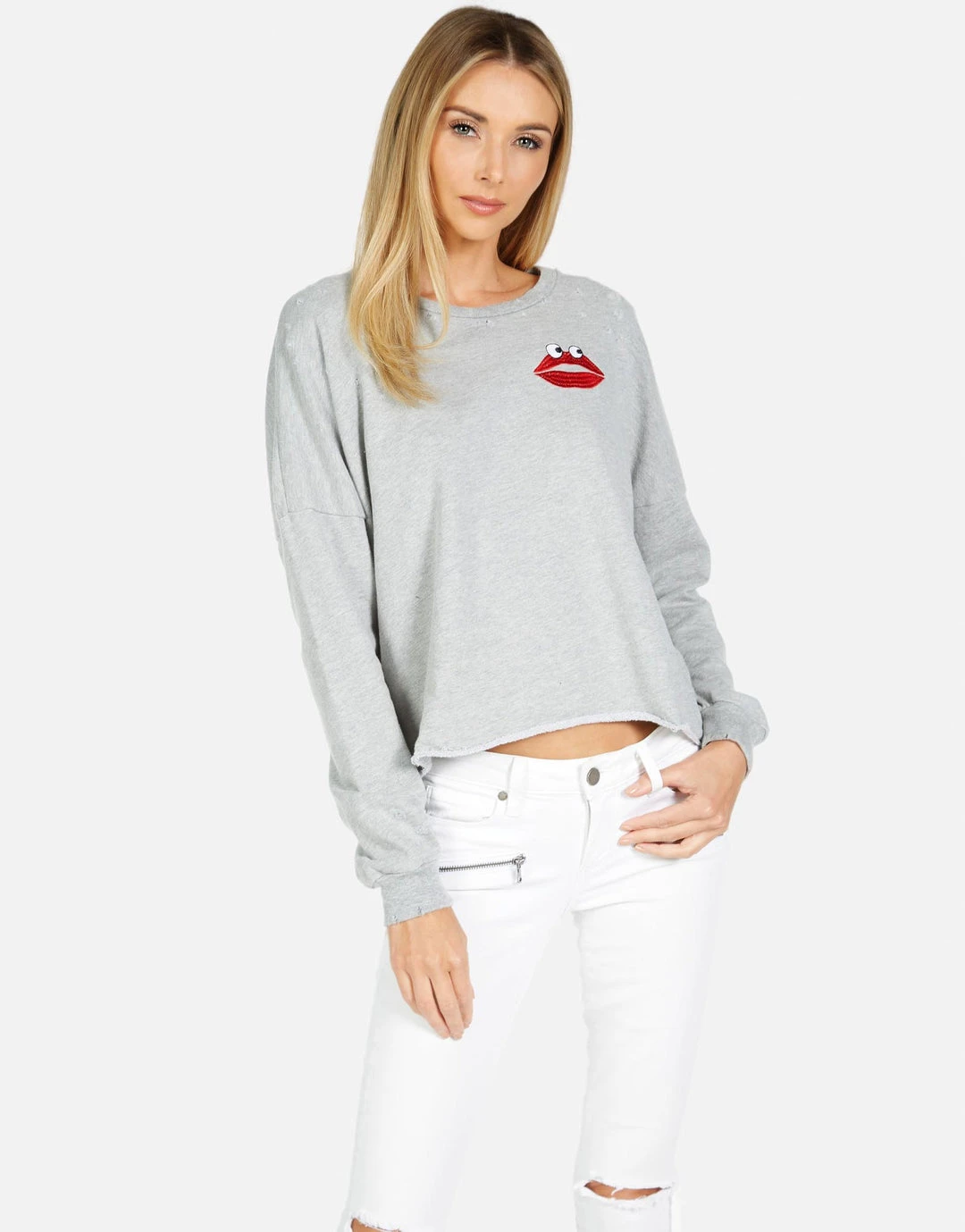 Kiss Face Printed on Ultra Soft Lightweight Pullover in Heather Grey by Lauren Moshi.