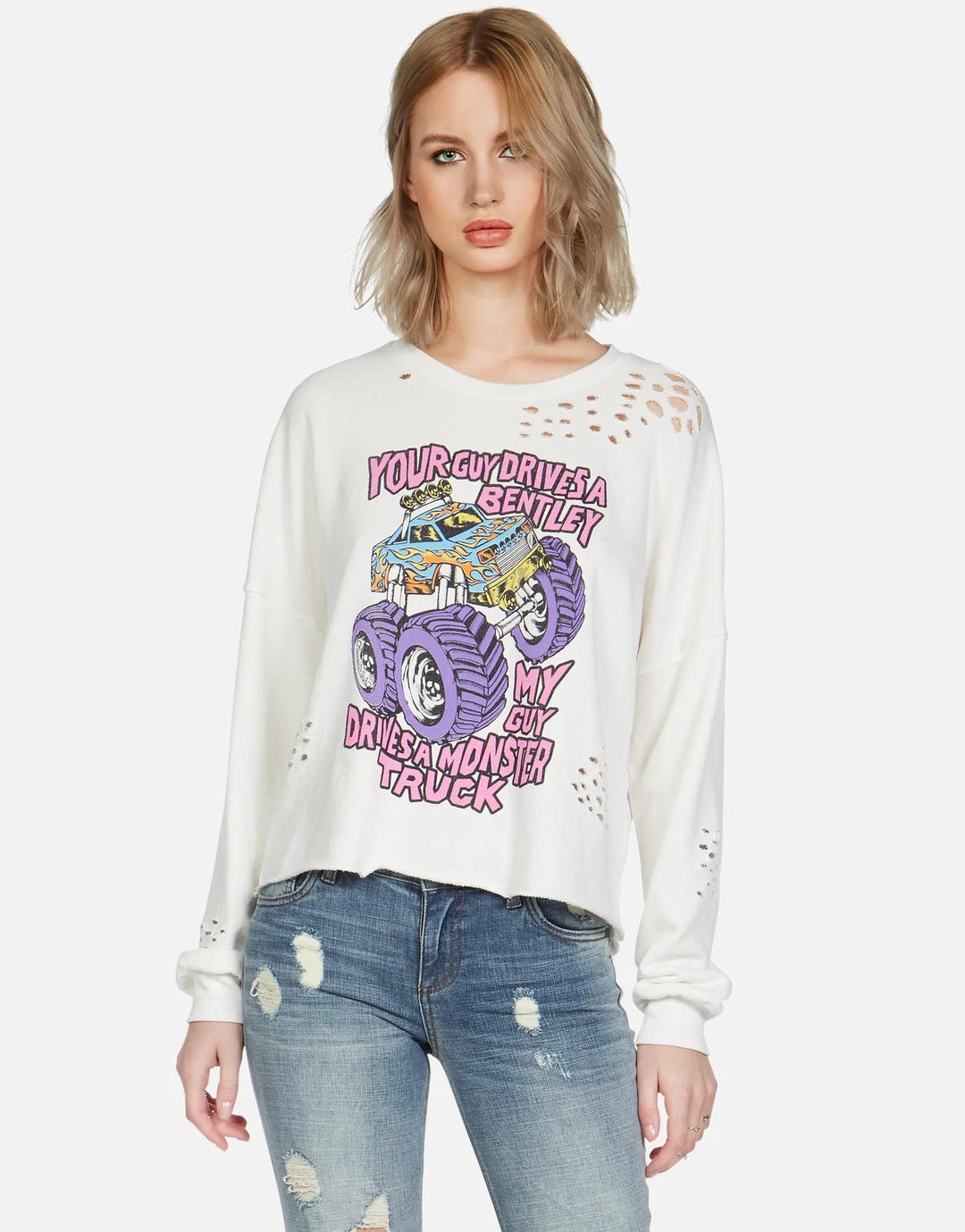 Monster Truck Printed on Ultra Soft Lightweight Pullover in Milk by Lauren Moshi.