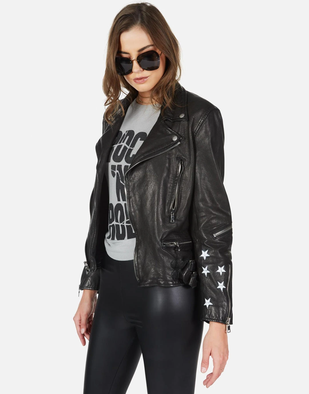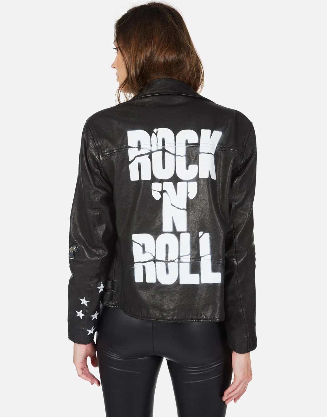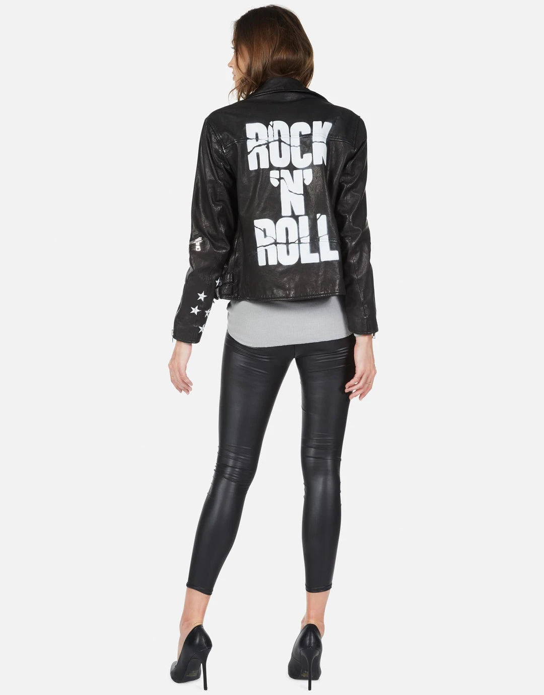 Rock ‘N’ Roll Printed on Leather Moto Jacket in Black by Lauren Moshi.