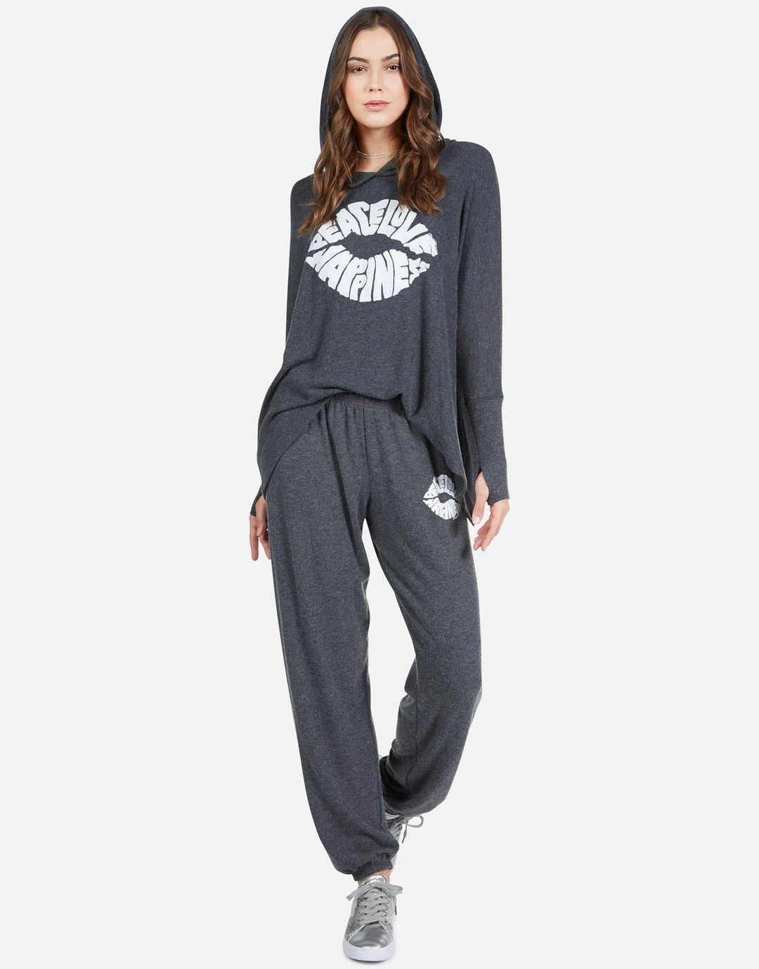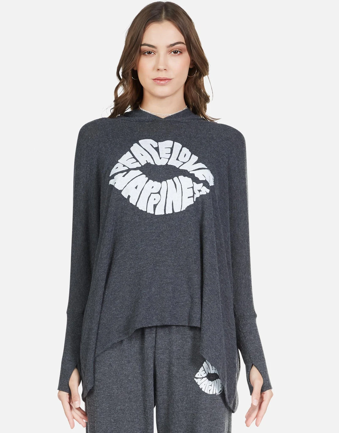 Happiness Lip Printed on Ultra Soft Lightweight Hoodie in Heather Black by Lauren Moshi.