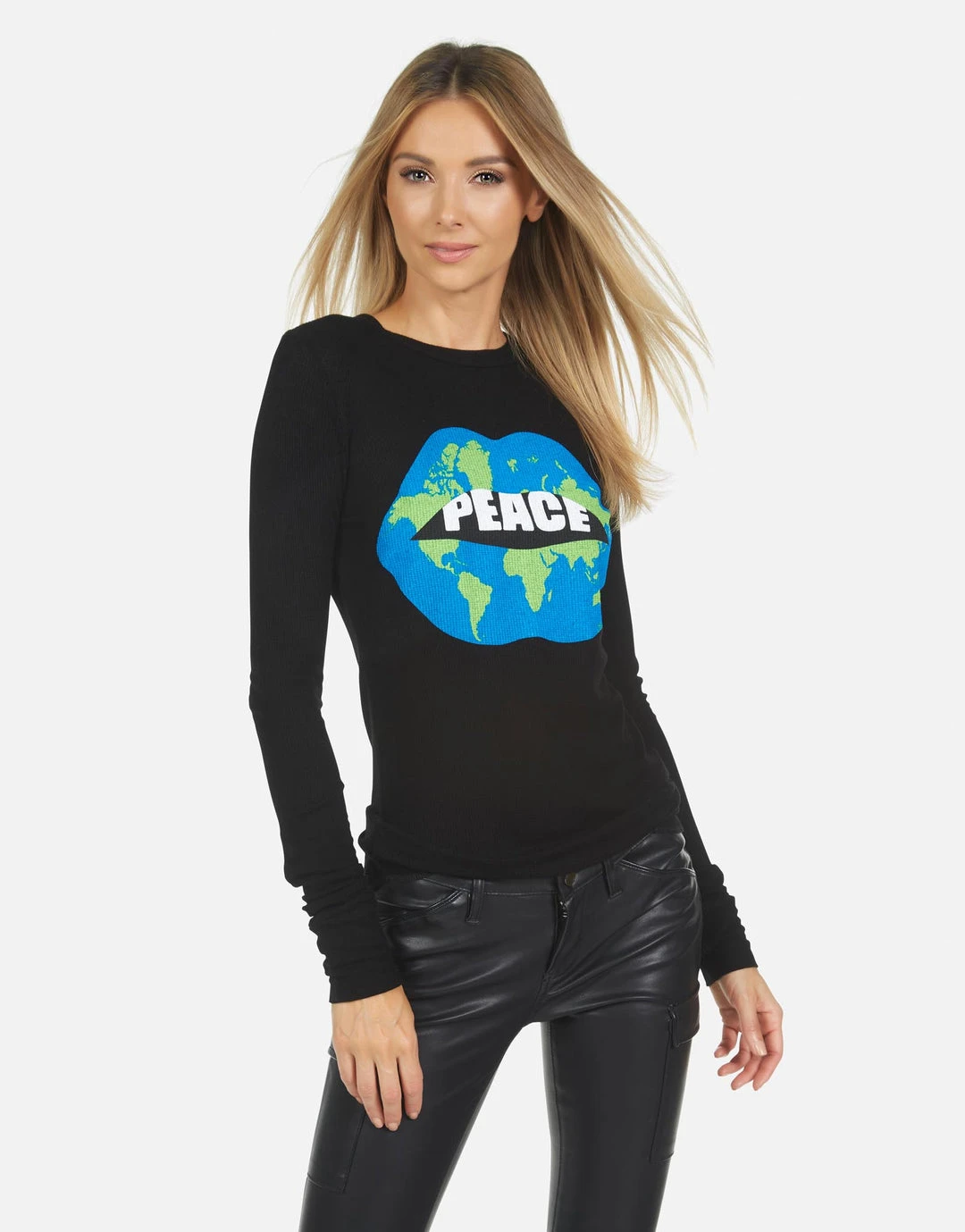 World Peace Lips Printed on Ultra Soft Lightweight Thermal in Black by Lauren Moshi.