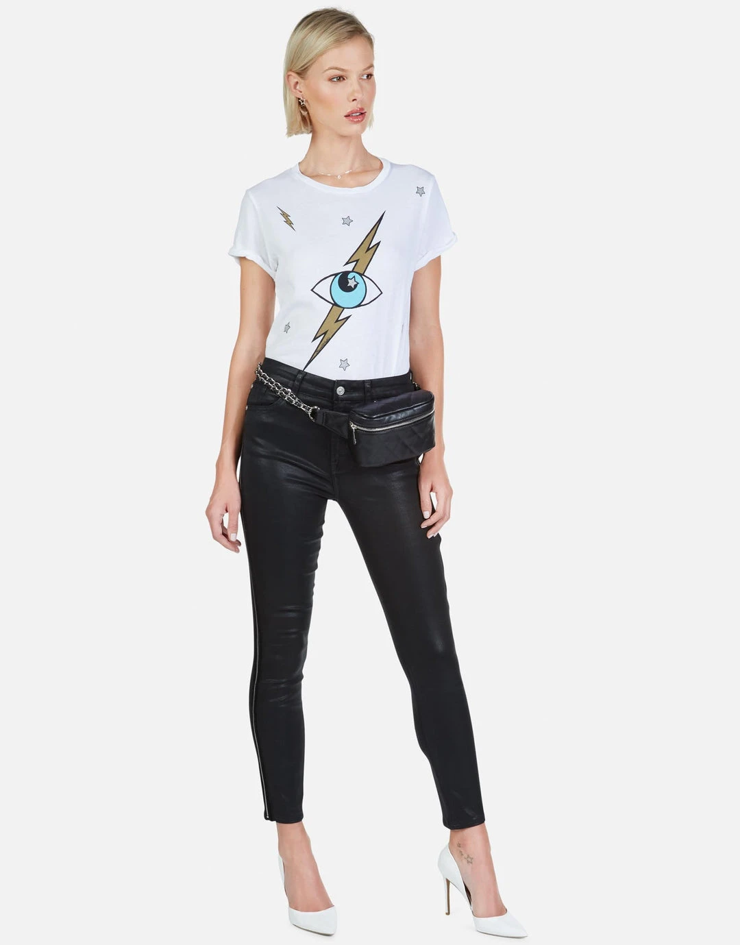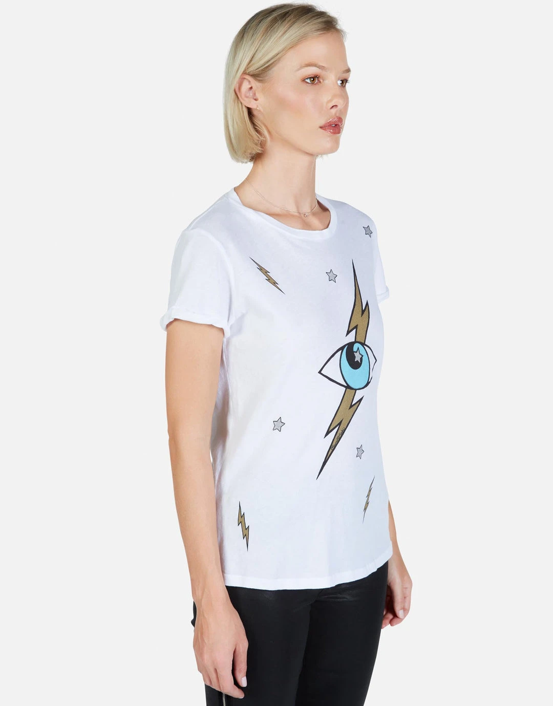 Lightning Storm Eye Printed on Ultra Soft Lightweight V-Back Tee in White by Lauren Moshi.