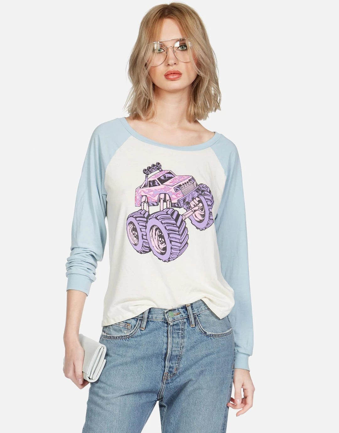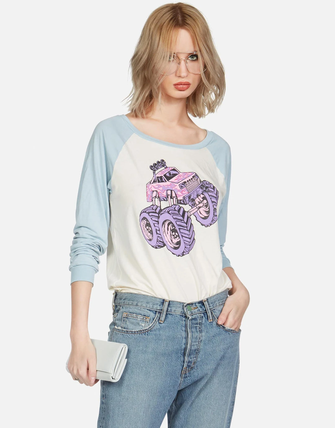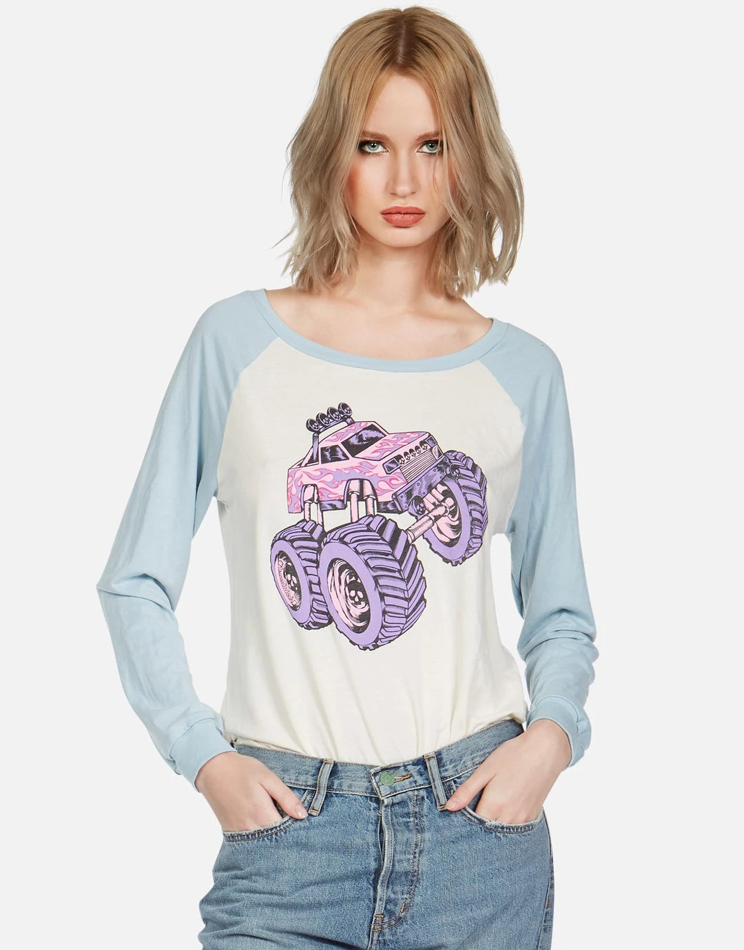 Monster Truck Printed on Ultra Soft Lightweight Baseball Tee in Faded White / Pearl Blue by Lauren Moshi.