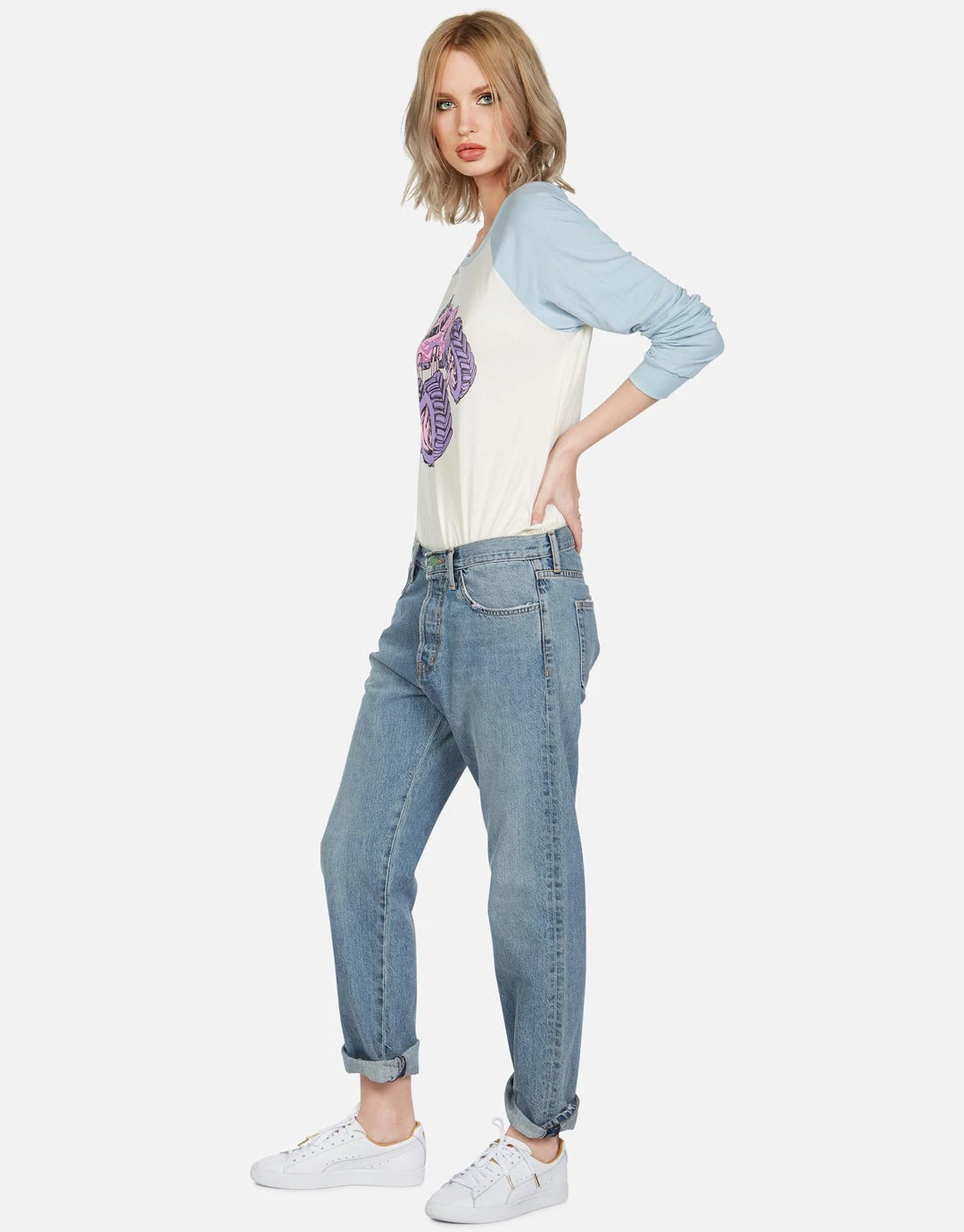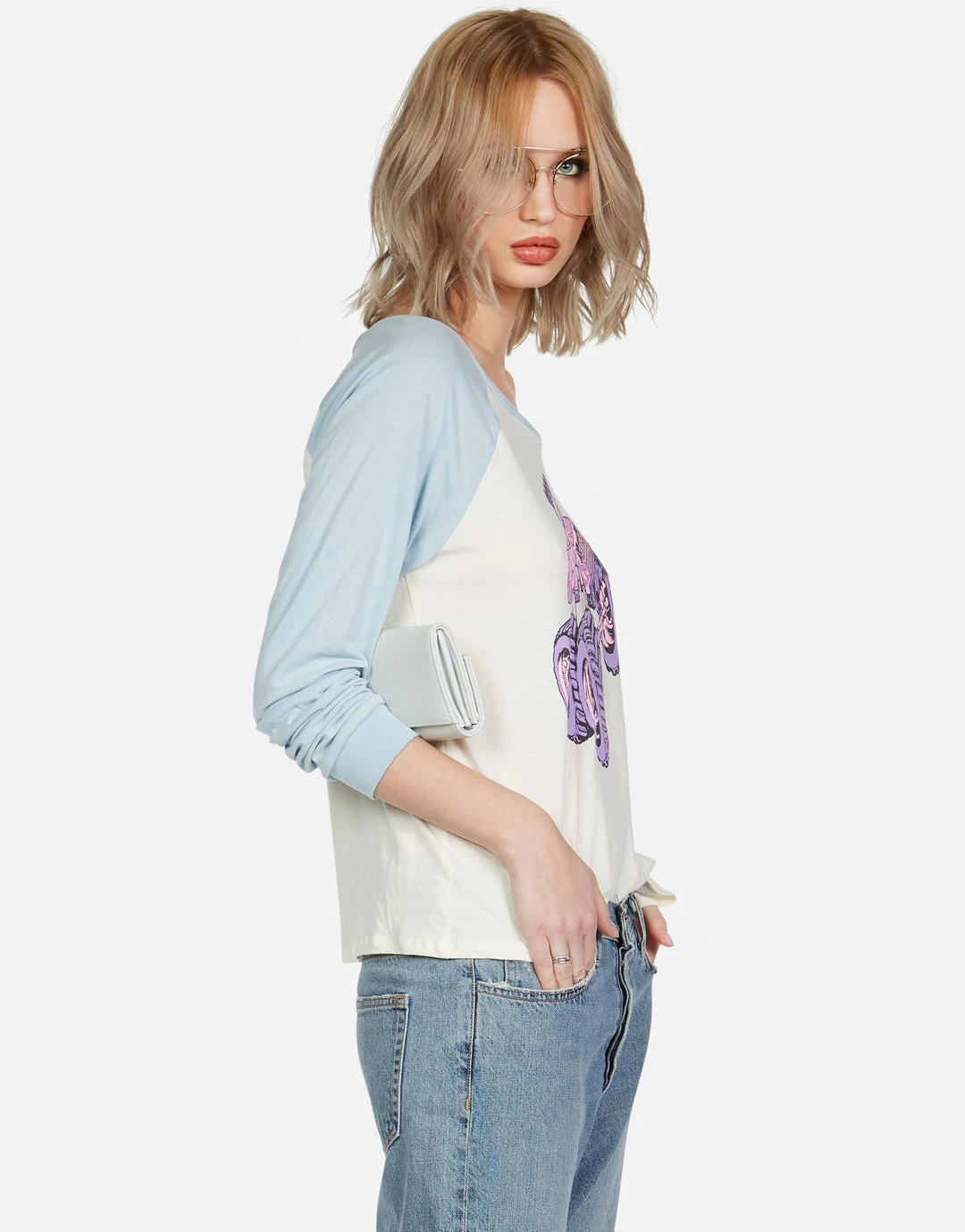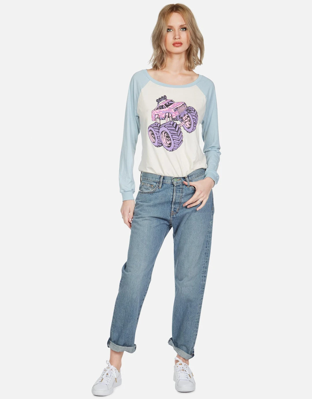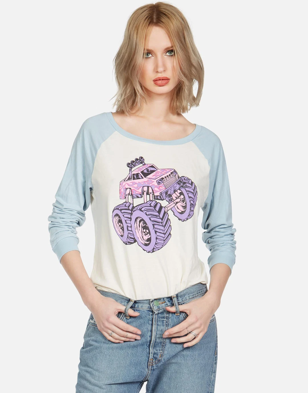 Monster Truck Printed on Ultra Soft Lightweight Baseball Tee in Faded White / Pearl Blue by Lauren Moshi.