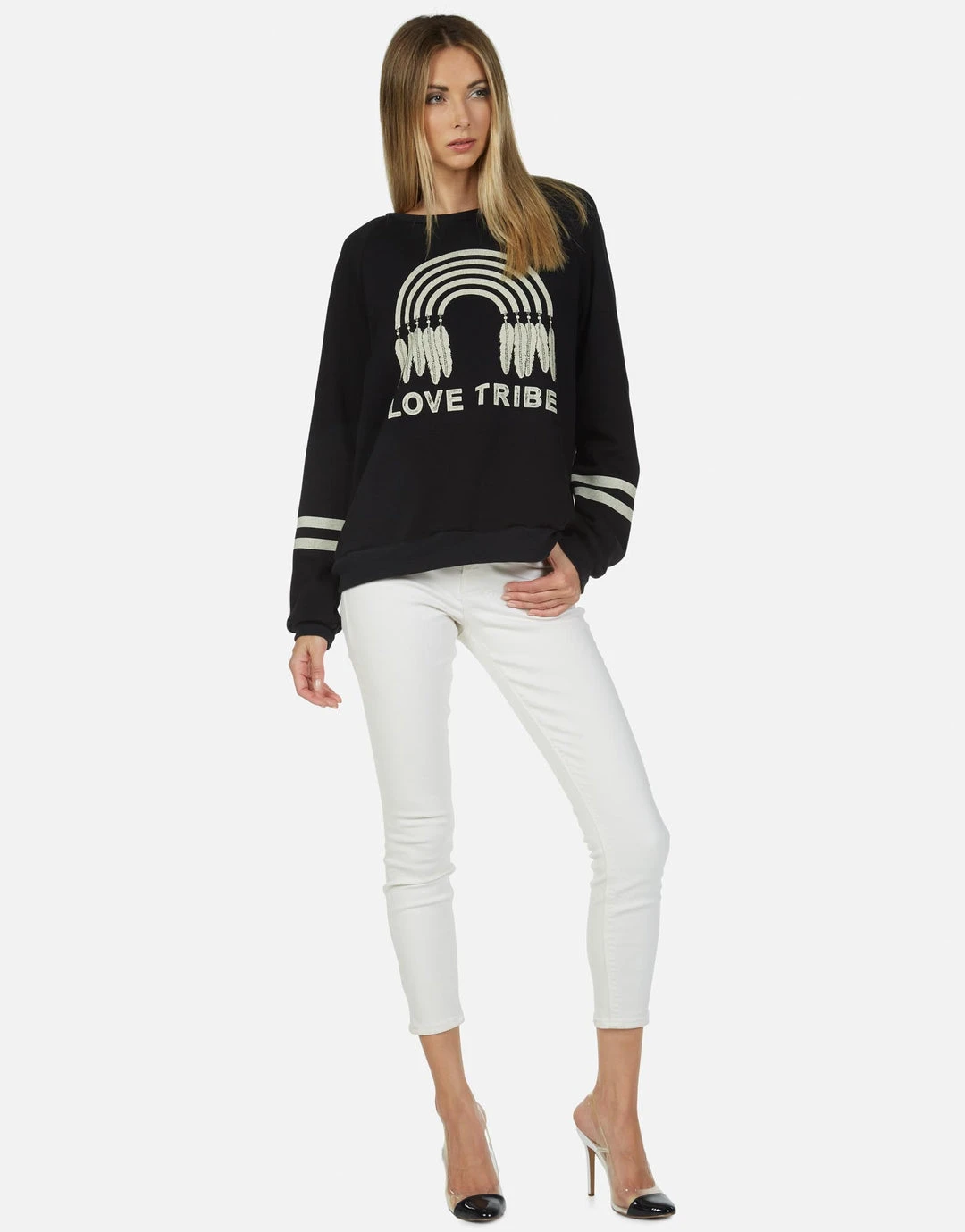 Love Tribe Printed on Ultra Soft Lightweight Pullover in Black by Lauren Moshi.