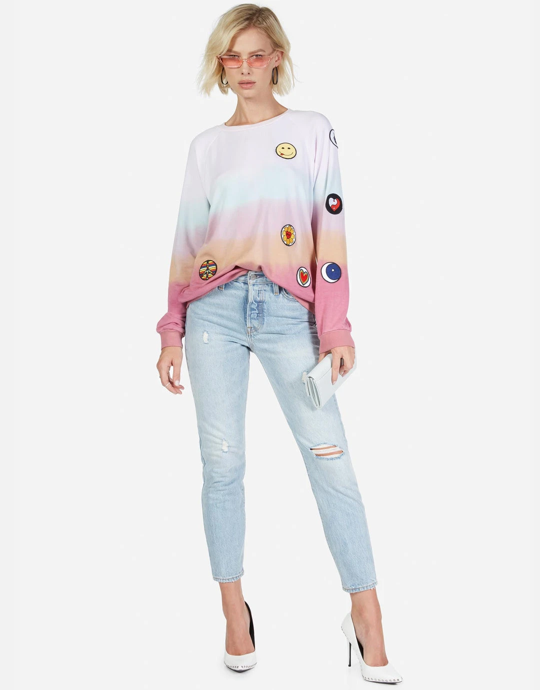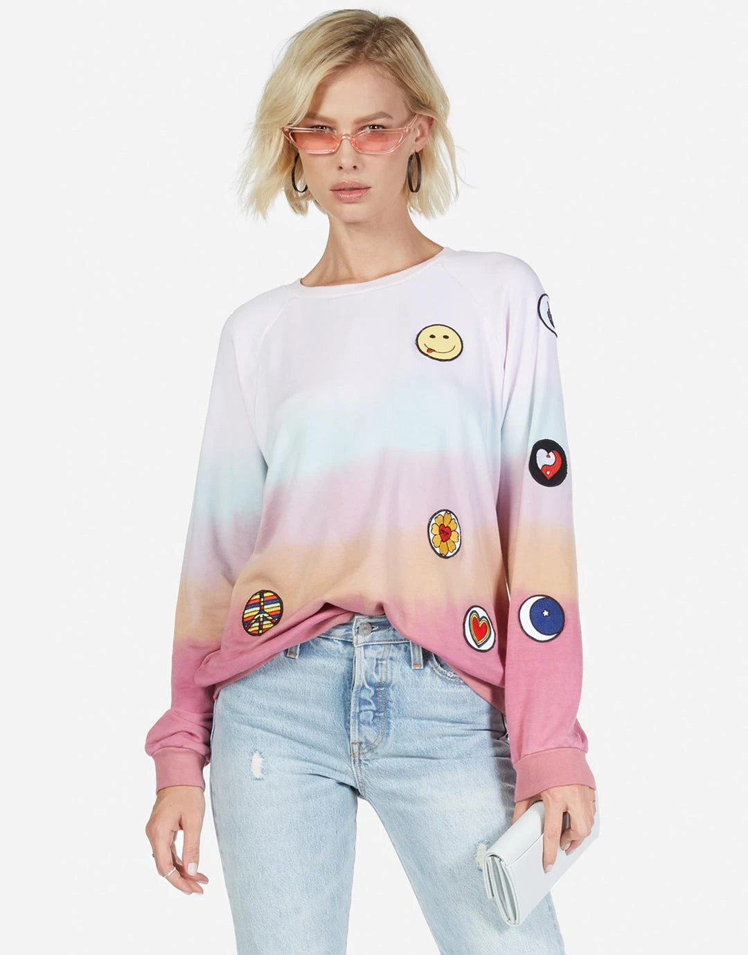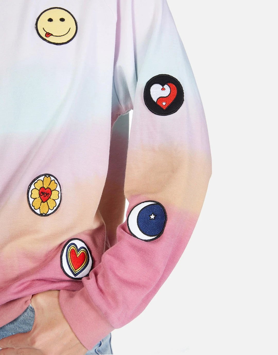 Hippie Peace Love Patches on Ultra Soft Lightweight Pullover in Harvest Moon by Lauren Moshi.