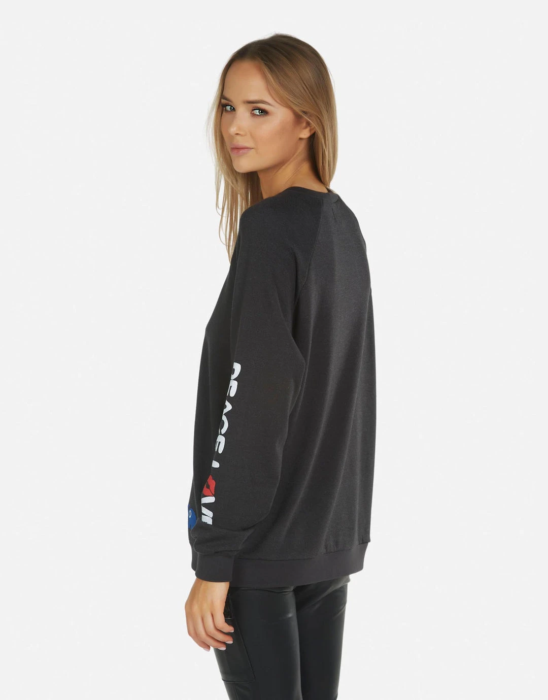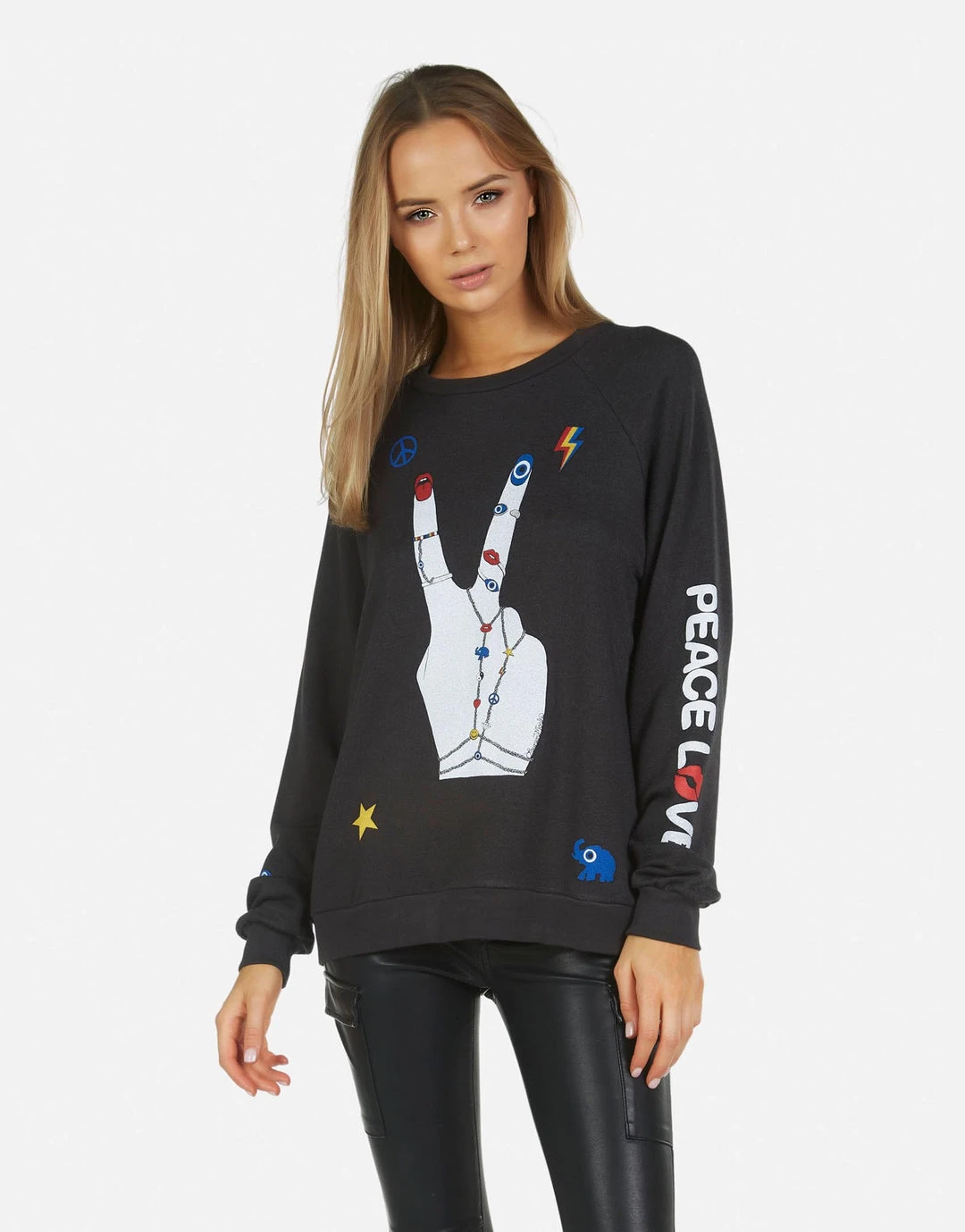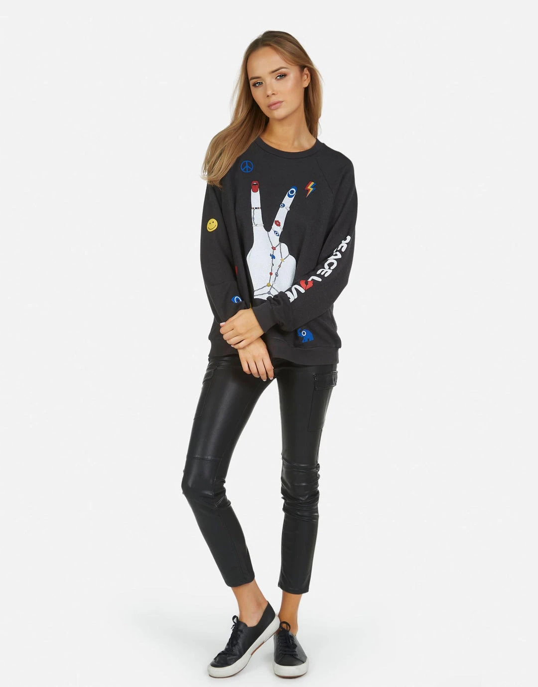 Peace Hand Elements Printed on Ultra Soft Lightweight Pullover in Onyx by Lauren Moshi.