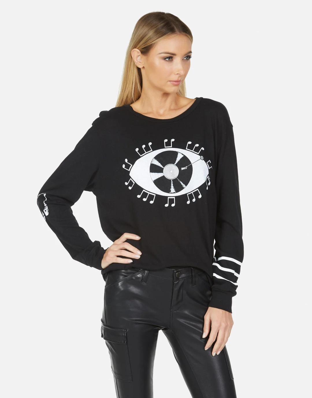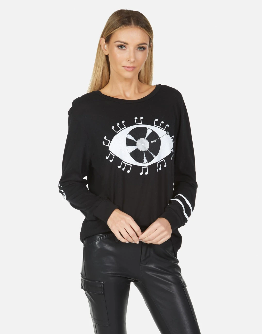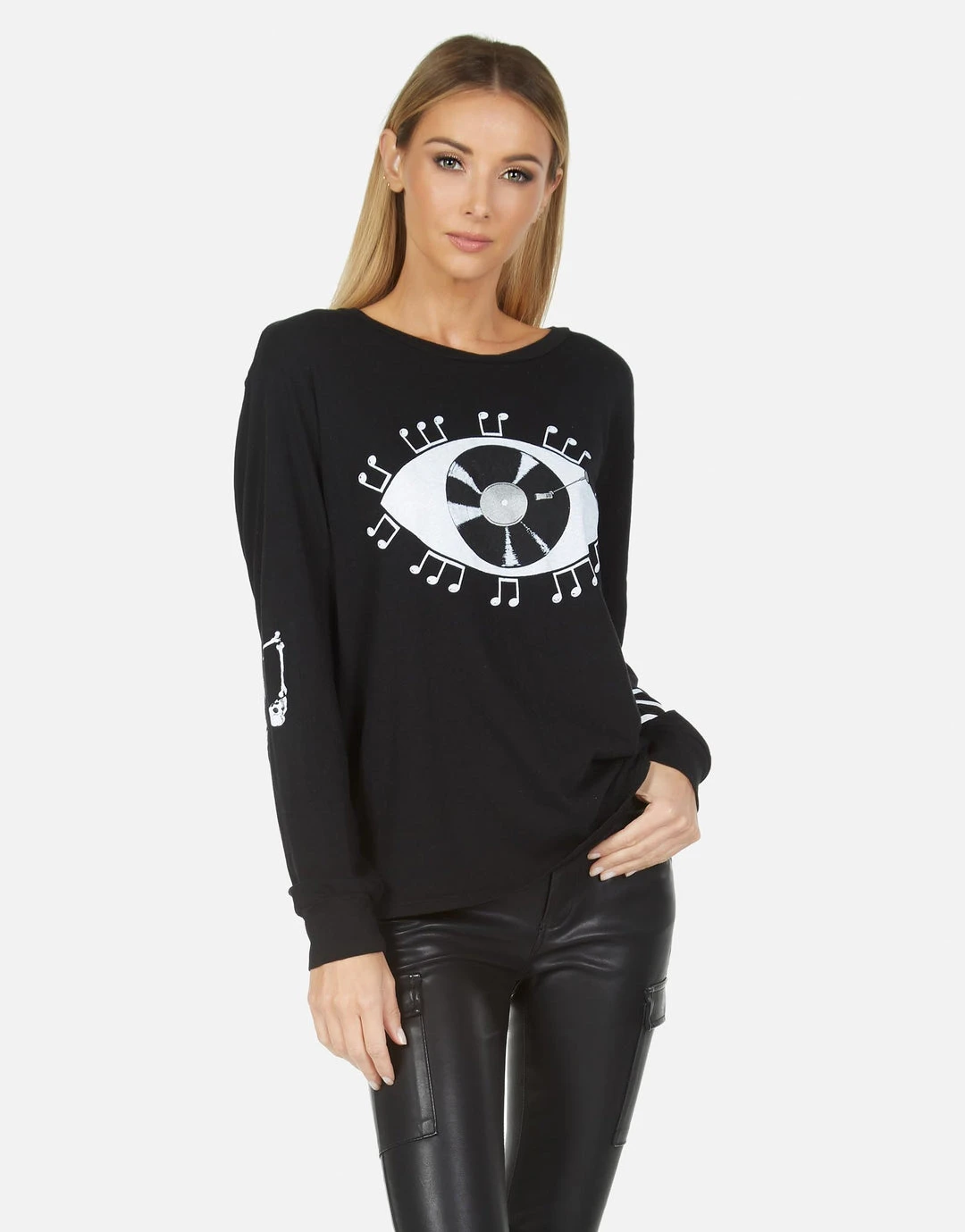 Record Eye Printed on Ultra Soft Lightweight Pullover in Black by Lauren Moshi.
