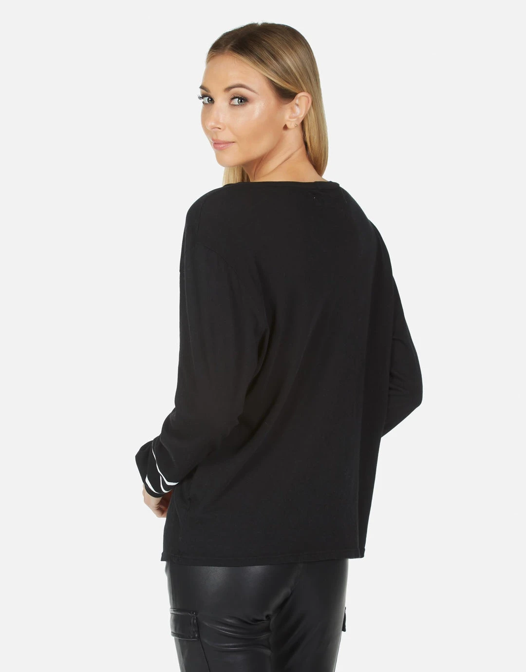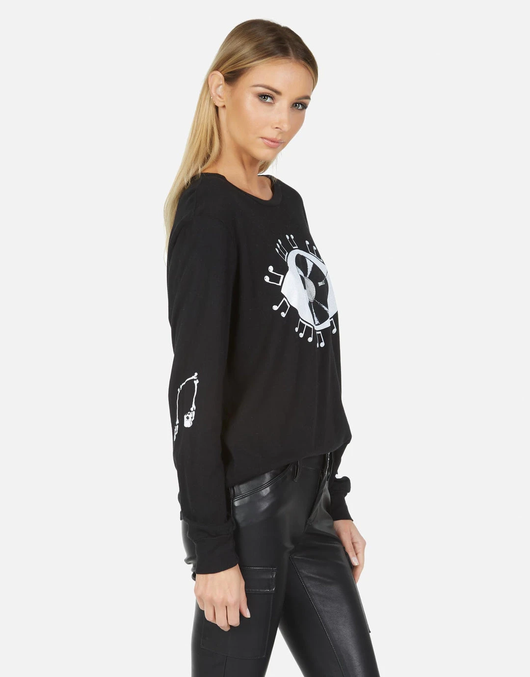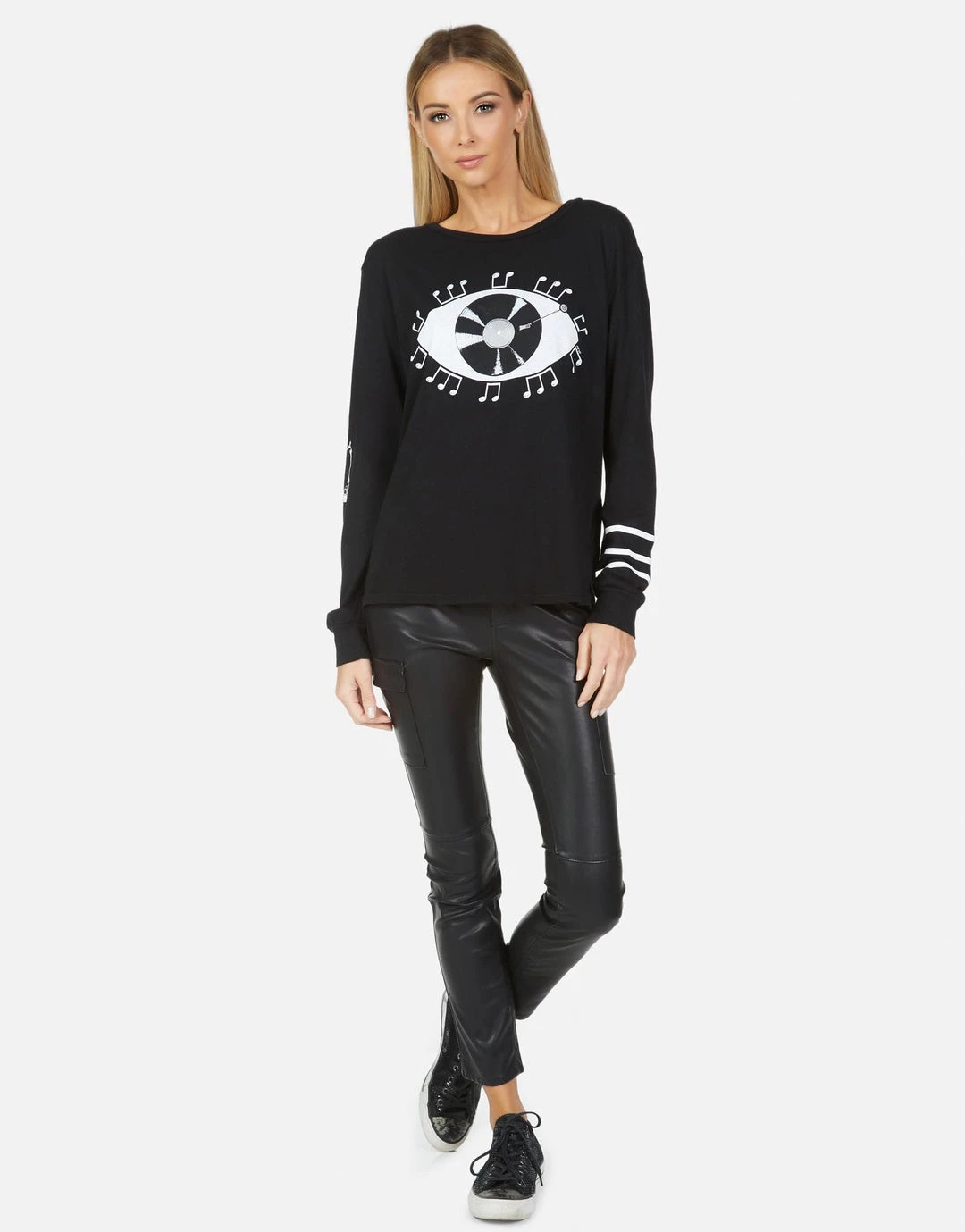 Record Eye Printed on Ultra Soft Lightweight Pullover in Black by Lauren Moshi.