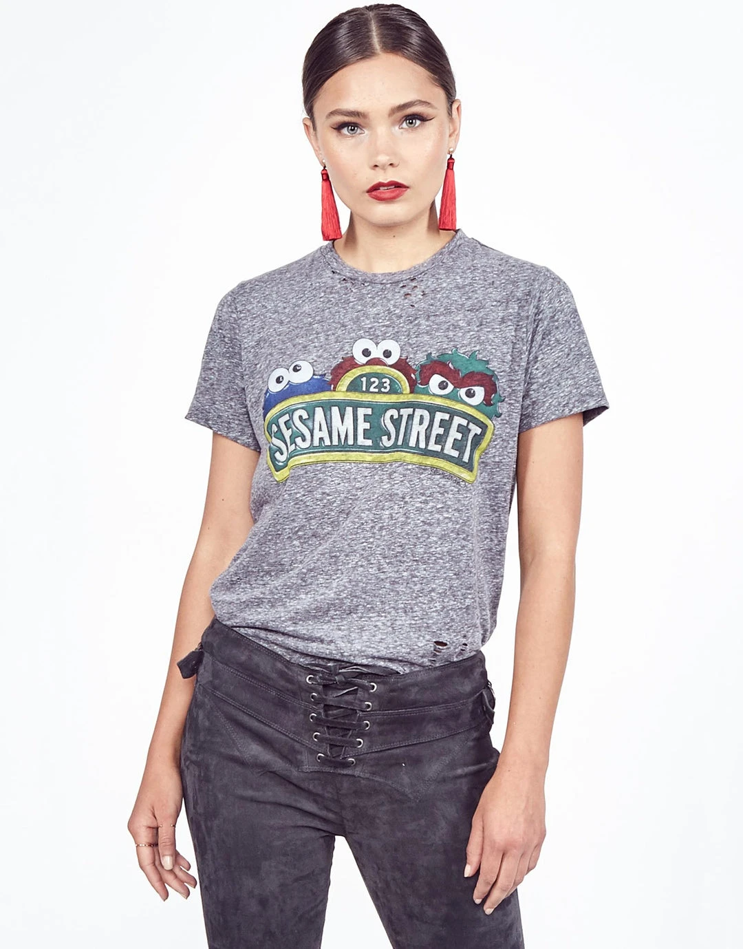 Sesame Street 123 Printed on Ultra Soft Lightweight Vintage Tee in Heather Grey by Lauren Moshi.
