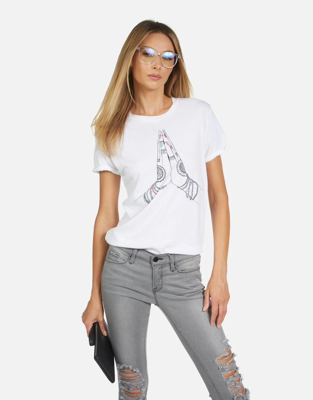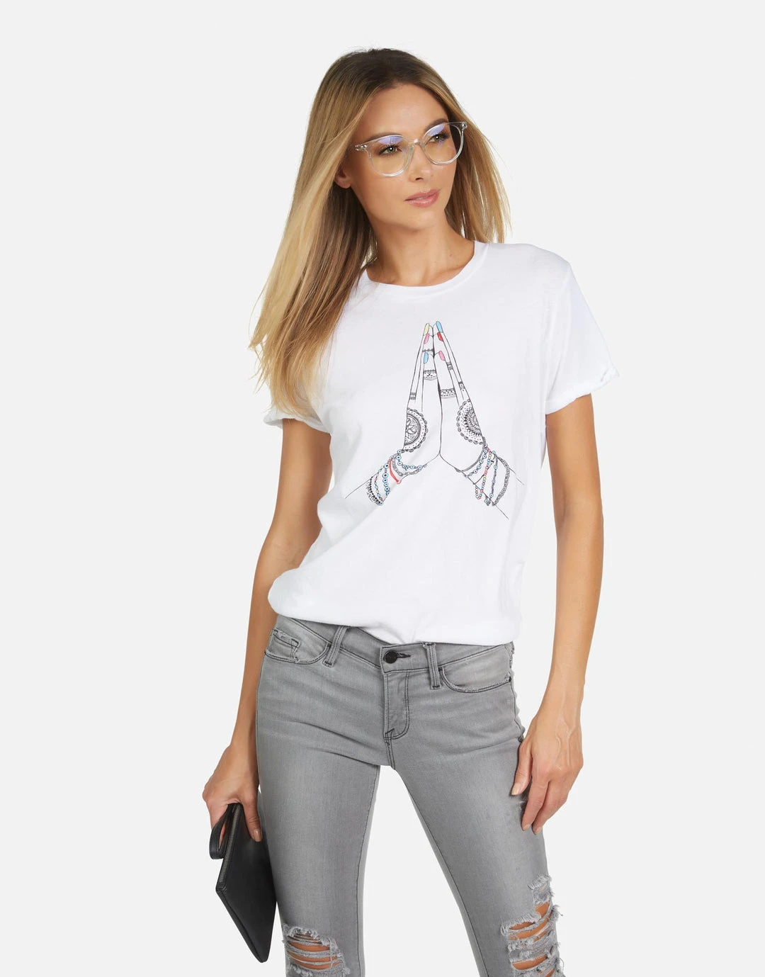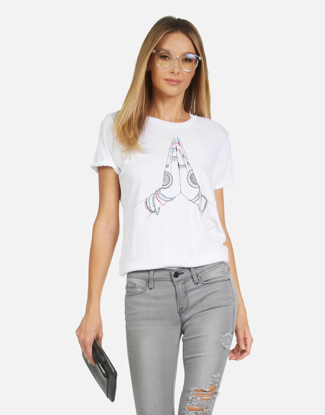 Prayer Hands Printed on Ultra Soft Lightweight Tee in White by Lauren Moshi.