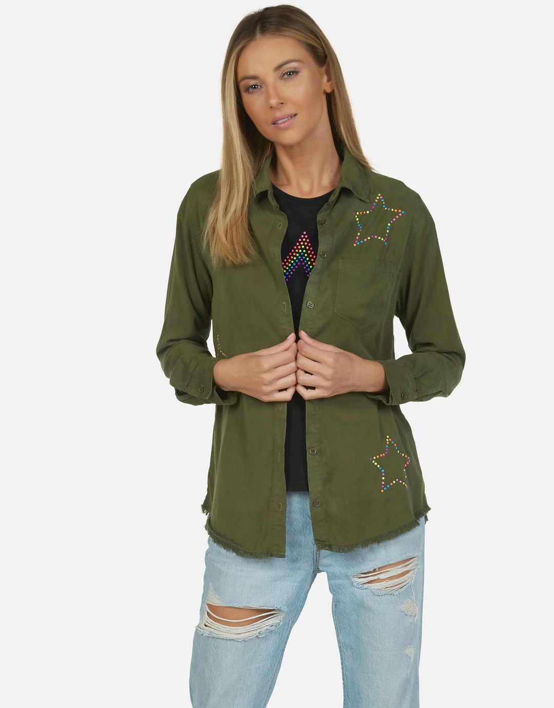 Neon Stud Star on Ultra Soft Lightweight Button Up in Military by Lauren Moshi.