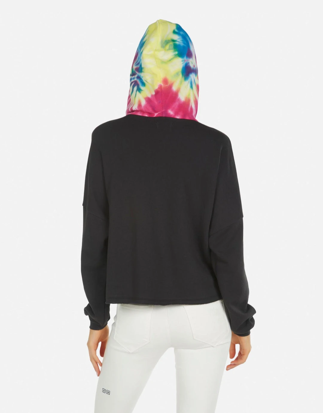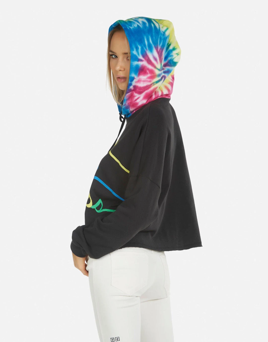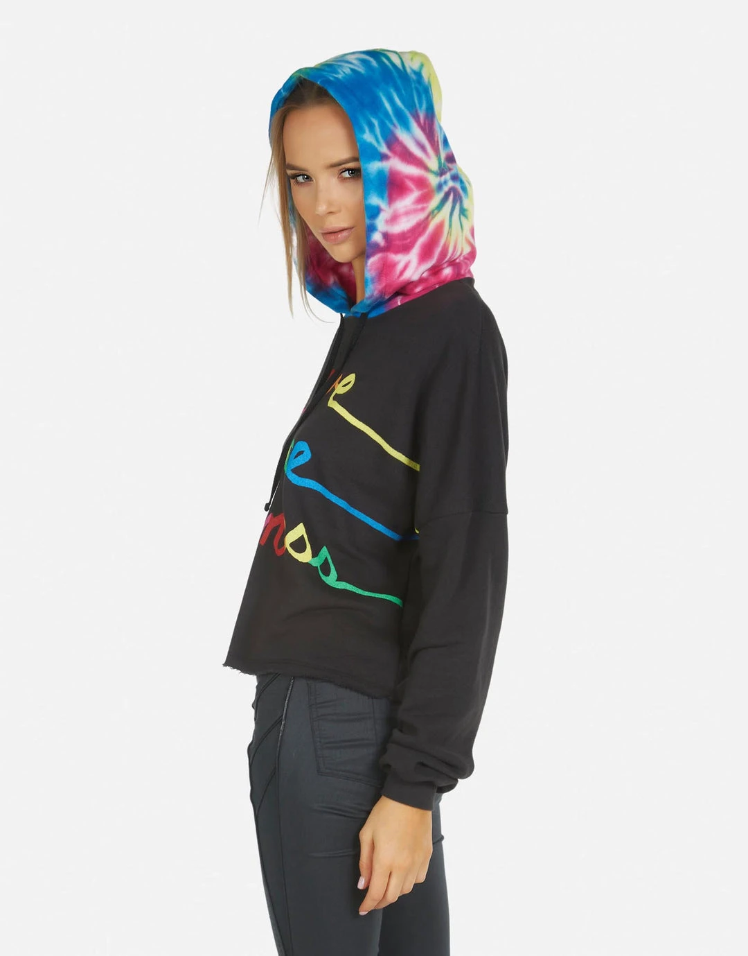 Love Peace Happiness Printed on Ultra Soft Lightweight Hoodie in Black/Candy by Lauren Moshi.