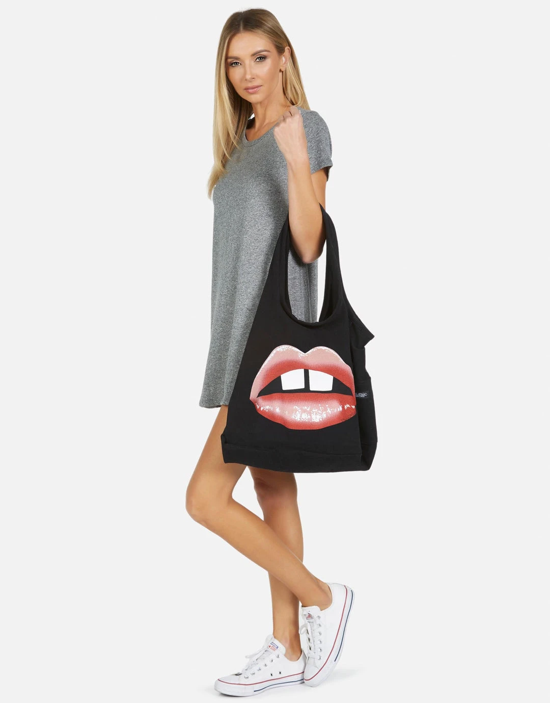 Gap Tooth Lip Printed on Ultra Soft Lightweight Tote Bag in Black by Lauren Moshi.