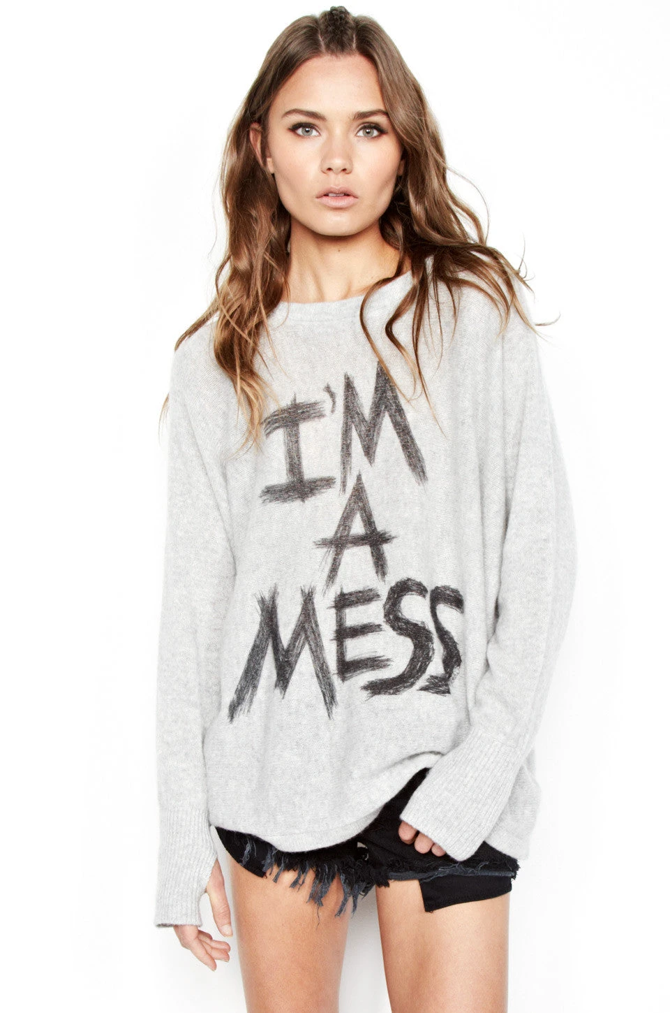 I’m A Mess Printed on Ultra Soft Lightweight Cashmere Sweater in Heather Grey by Lauren Moshi.