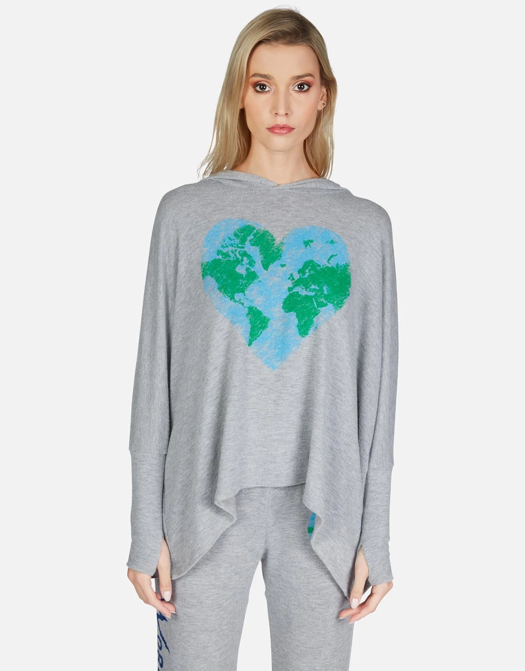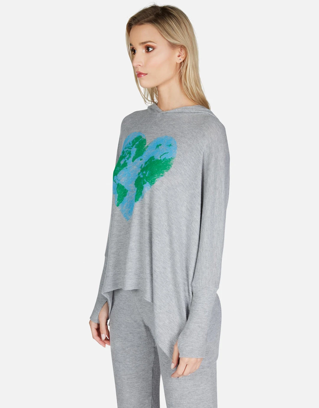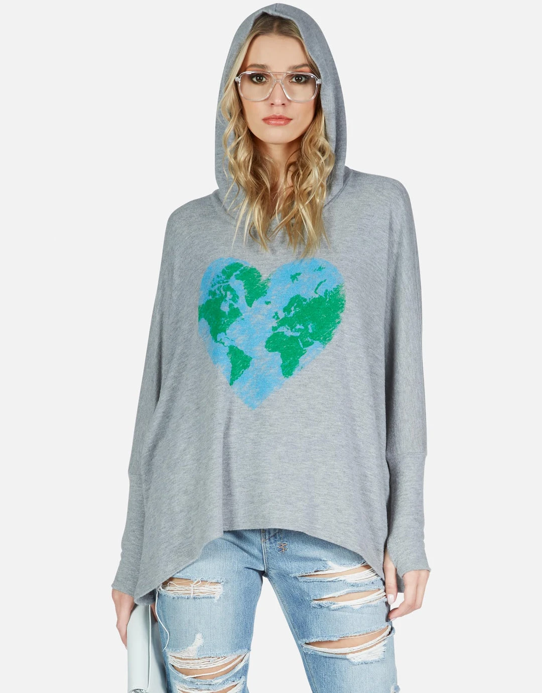 World Love Printed on Ultra Soft Lightweight Hoodie in Heather Grey by Lauren Moshi.