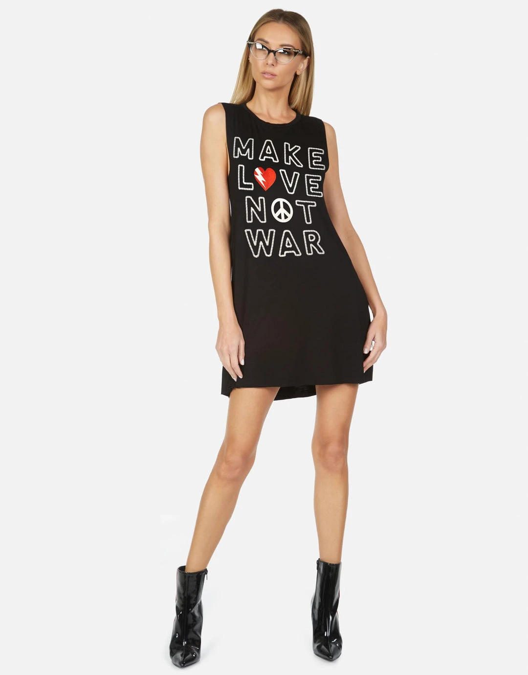 WEB EXCLUSIVE | Make Love Not War Printed on Ultra Soft Lightweight Mini Dress in Onyx by Lauren Moshi.